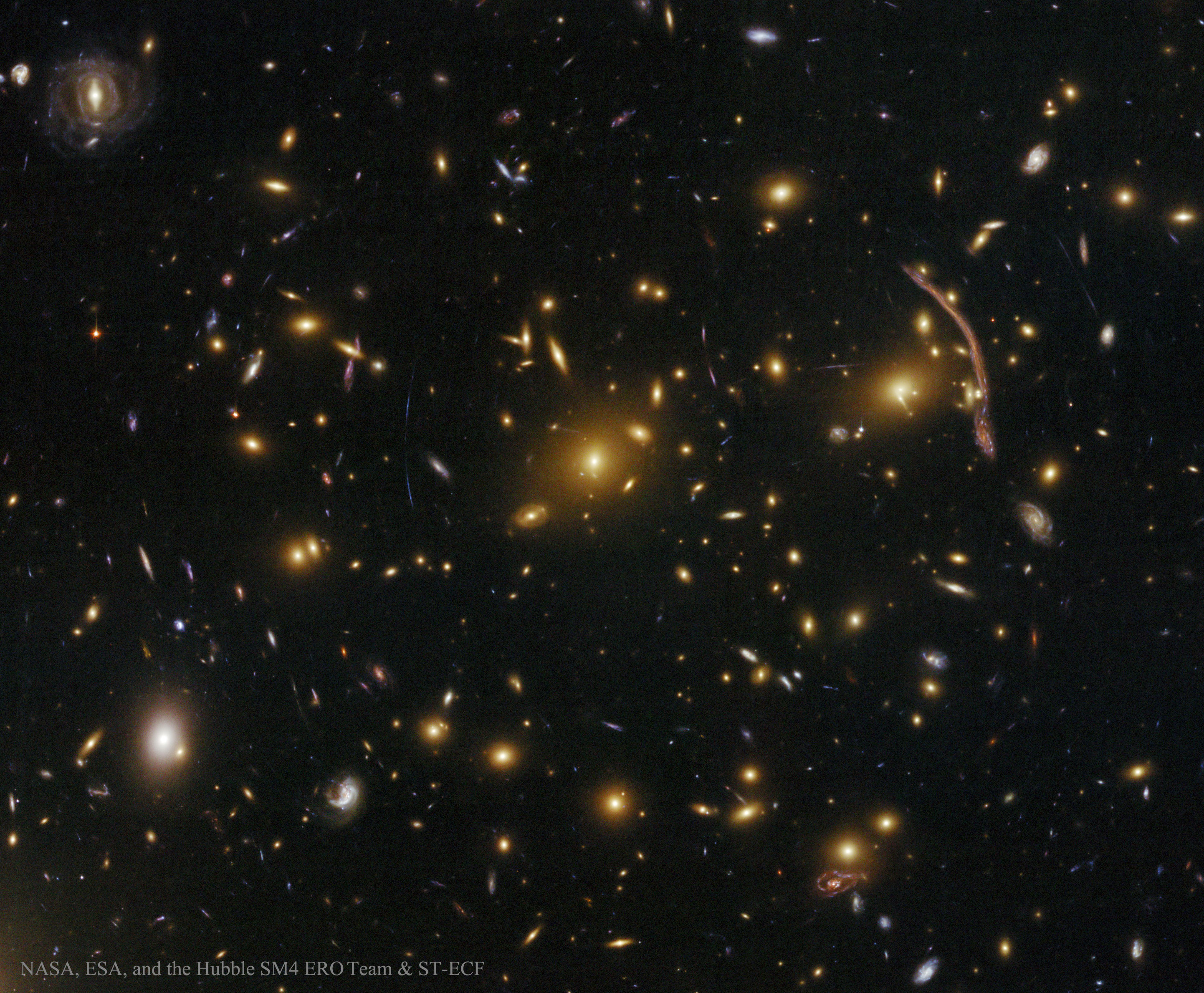 What is that strange arc? While imaging the cluster of galaxies Abell 370, astronomers had noted an unusual arc to the right of many cluster galaxies. Although curious, one initial response was to avoid commenting on the arc because nothing like it had ever been noted before. In the mid-1980s, however, better images allowed astronomers to identify the arc as a prototype of a new kind of astrophysical phenomenon -- the gravitational lens effect of entire cluster of galaxies on background galaxies. Today, we know that this arc actually consists of two distorted images of a fairly normal galaxy that happened to lie far behind the huge cluster. Abell 370's gravity caused the background galaxies' light -- and others -- to spread out and come to the observer along multiple paths, not unlike a distant light appears through the stem of a wine glass. In mid-July of 2009, astronomers used the then just-upgraded Hubble Space Telescope to image Abell 370 and its gravitational lens images in unprecedented detail. Almost all of the yellow images featured here are galaxies in the Abell 370 cluster. An astute eye can pick up many strange arcs and distorted arclets, however, that are actually images of more distant galaxies. Studying Abell 370 and its images gives astronomers a unique window into the distribution of normal and dark matter in galaxy clusters and the universe. Free Download: APOD 2017 Calendar: NASA Images