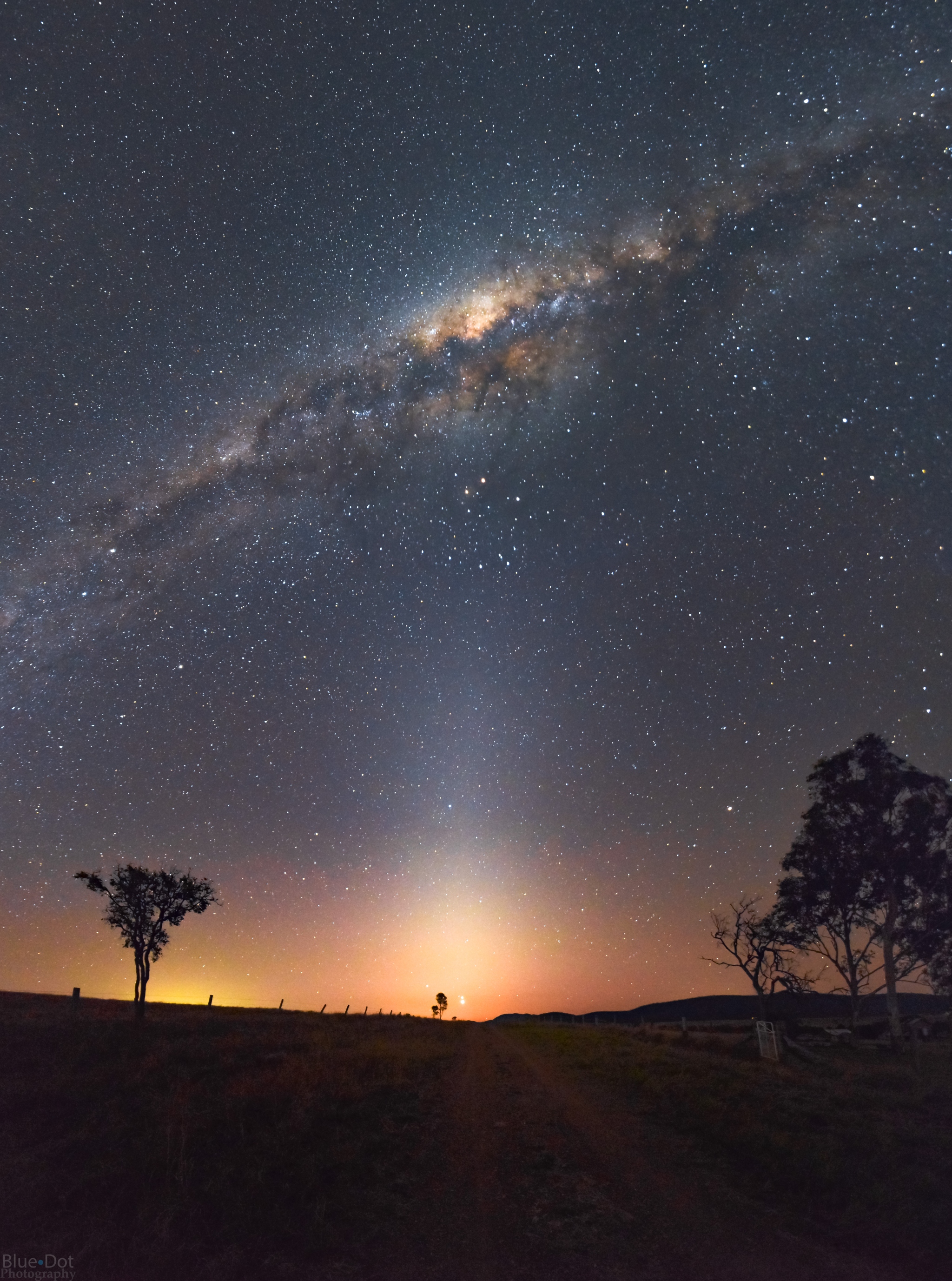 The bright light at the end of this country road is actually a remarkably close conjunction of two planets. After sunset on August 27 brilliant Venus and Jupiter almost appear as a single celestial beacon in the night skyscape taken near Lake Wivenhoe, Queensland, Australia. A spectacular vertical panorama from the southern hemisphere, it shows the central Milky Way near zenith, posed on top of a pillar of Zodiacal light along the ecliptic plane. Of course Mars and Saturn are near the ecliptic too, just below the galaxy's central bulge. Above and left of a tree on the horizon, fleeting planet Mercury also adds to the light at the end of the road.
