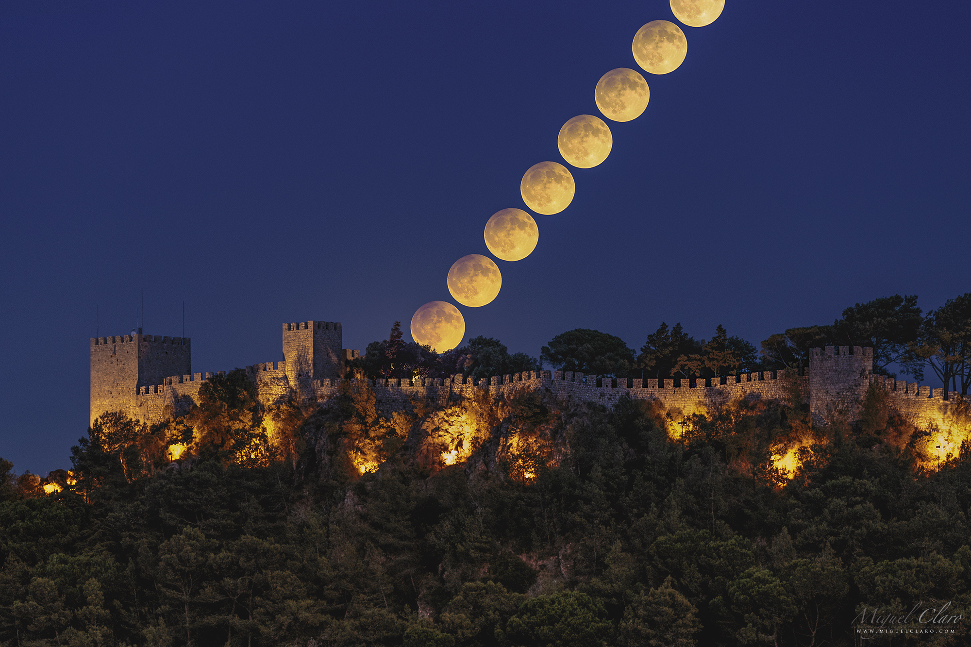 A Harvest Moon rises over Sesimbra Castle south of Lisbon in this impressive series of telephoto exposures. Captured at its full phase, the golden Moon was also gliding through the Earth's more diffuse outer shadow during September's penumbral lunar eclipse. The eclipse shading is subtle compared to a total lunar eclipse. Still, the penumbral shadow does darken the Moon's upper limb, the pale shadow receding as the Moon climbs into Portugal's evening sky. In this eclipse timelapse the effect of sunlight and earthshadow on the Moon looks remarkably like the coloring of light and shadow along the illuminated castle walls.