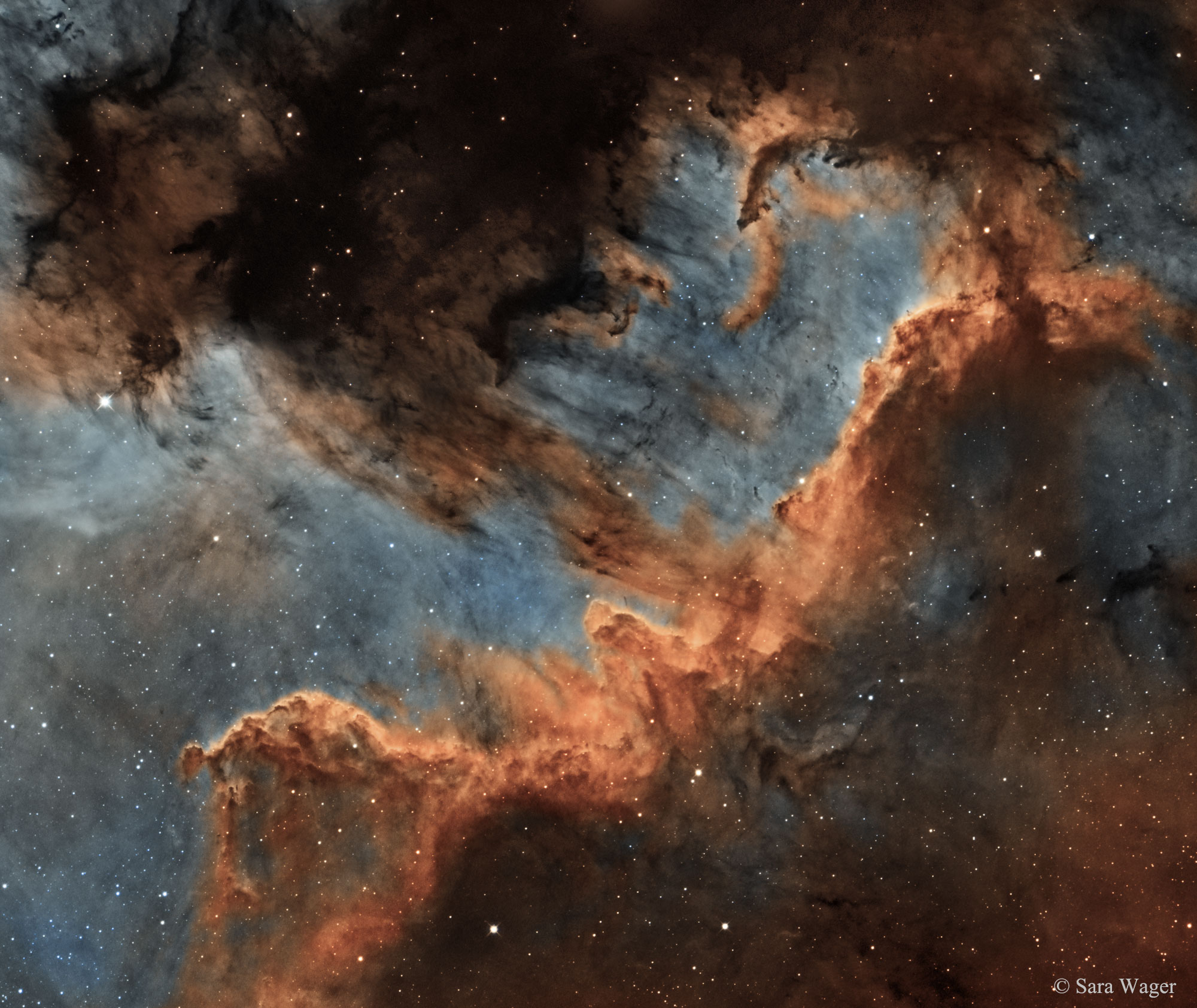 A veces, las estrellas se forman en paredes — brillantes paredes de gas interestelar. En este vibrante paisaje celeste, las estrellas se forman en la cresta en forma de W de emisión conocida como la Pared de Cisne. Parte de una mayor nebulosa de emisión con un contorno distintivo popularmente llamada la Nebulosa de América del Norte, la cresta cósmica abarca aproximadamente 20 años luz. Construida utilizando datos de banda estrecha para resaltar el característico brillo rojizo de los átomos de hidrógeno ionizados que se recombinan con electrones, la imagen mosaico sigue una frontera de ionización con detalles finos de formas oscuras y polvorientas en silueta. Esculpidas por la radiación energética de las jóvenes, calientes y masivas estrellas de la región, las formas oscuras que habitan la vista son nubes de gas y polvo frío con estrellas que probablemente se están formando dentro. La Nebulosa de América del Norte en sí misma, NGC 7000, se encuentra a unos 1.500 años luz de distancia.