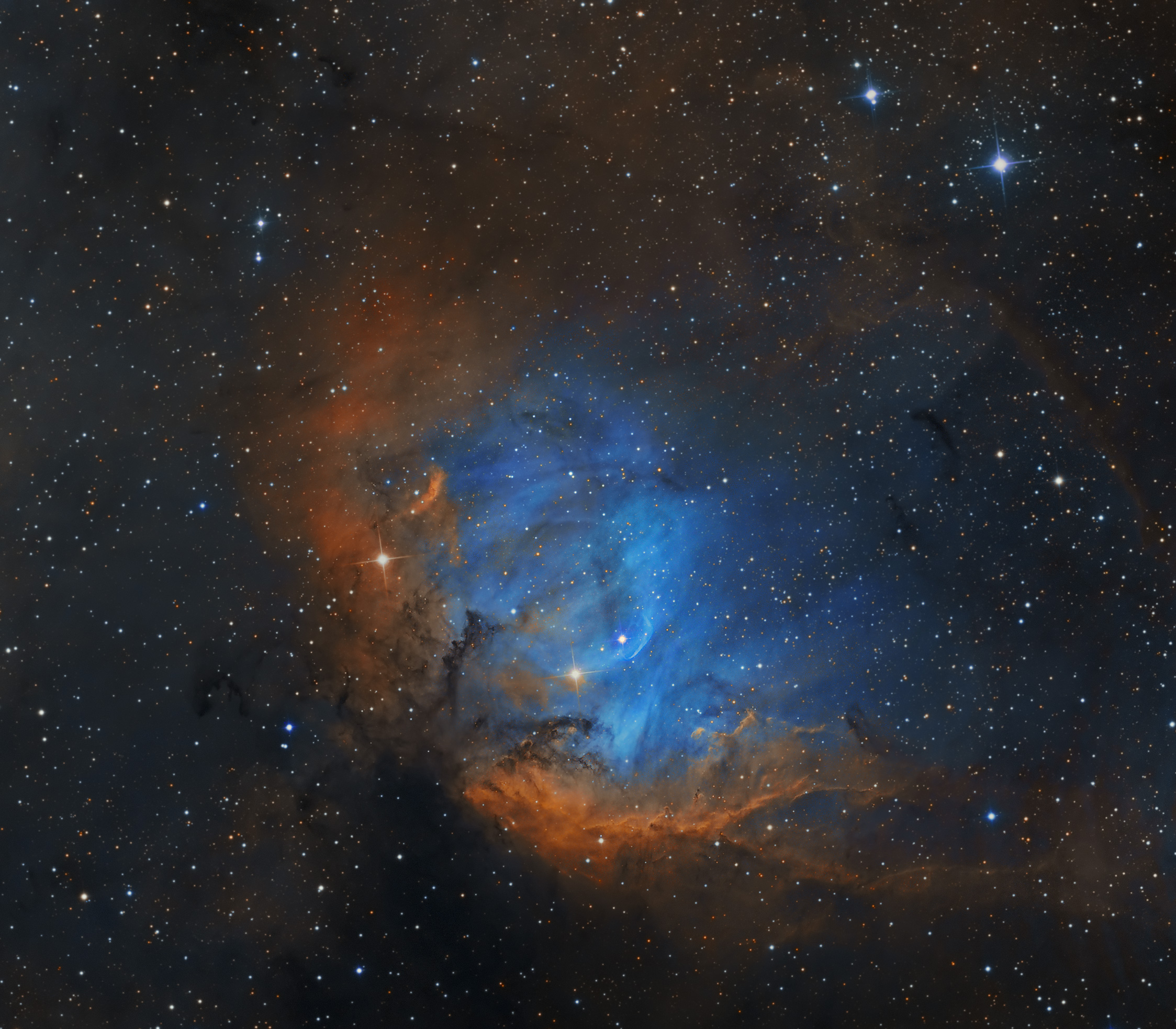 Este amplio campo visual capturado por un telescopio se dirige a lo largo del plano de nuestra Galaxia Vía Láctea hacia la constelación rica en nebulosas de Cisne. Popularmente conocida como la Nebulosa Tulipán, la nube brillante de gas e interstelar también se encuentra en el catálogo de 1959 del astrónomo Stewart Sharpless como Sh2-101. A unos 8.000 años luz de distancia y con un diámetro de 70 años luz, la compleja y bella nebulosa florece en el centro de la imagen compuesta. Los tonos rojo, verde y azul representan la emisión de átomos ionizados de azufre, hidrógeno y oxígeno. La radiación ultravioleta de estrellas jóvenes y energéticas en el borde de la asociación estelar Cygnus OB3, incluida la estrella O HDE 227018, ioniza los átomos y alimenta la emisión visible de la Nebulosa Tulipán. HDE 227018 es la estrella brillante muy cercana al arco azul en el centro de la tulipán cósmica.