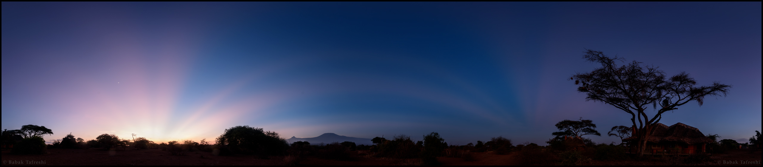 En esta mañana de noviembre, una vieja luna creciente y la estrella matutina se levantan poco antes del Sol en un amplio paisaje celeste capturado desde el Parque Nacional Amboseli en Kenia. Aún por debajo de las copas de un árbol acacia y el horizonte oriental, la posición del Sol es fácil de identificar. Está marcada a la izquierda por la sutil convergencia de luz y sombra en el cielo del amanecer. Conocidas como rayos crepusculares, las rayas de luz cálida están delimitadas por sombras proyectadas por nubes invisibles cerca del horizonte. Arqueándose sobre el perfil del Monte Kilimanjaro, hacia la derecha, los rayos de luz y sombra convergen en el horizonte occidental. Allí, conocidos como rayos anti-crepusculares, indican el punto opuesto al Sol naciente. Las sombras de las nubes son casi paralelas, pero convergen hacia los horizontes distantes debido a la perspectiva.