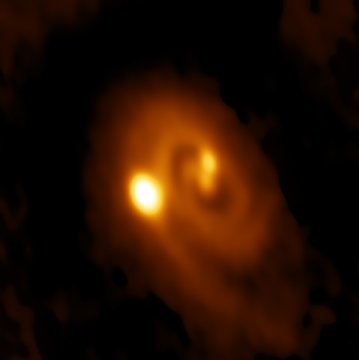 Un sistema estelar triple está en formación, envuelto dentro de este disco natal polvoriento ubicado a unos 750 años luz de distancia en la nube molecular de Perseo. Imagenada en longitudes de onda milimétricas por el Gran Observatorio Milimétrico/submilimétrico de Atacama (ALMA) en Chile, la imagen de gran aumento muestra dos protocometas separados por apenas 61 UA (1 UA es la distancia Tierra-Sol) con un tercero a 183 UA del protocometa central. La imagen de ALMA también revela una clara estructura espiral que indica que la inestabilidad y la fragmentación condujeron a la formación de múltiples objetos protostelares dentro del disco. Los astrónomos estiman que el sistema, catalogado como L1448 IRS3B, tiene menos de 150 000 años. Capturado en una fase temprana, este escenario de formación estelar probablemente no es en absoluto inusual, ya que casi la mitad de todas las estrellas similares al Sol tienen al menos un compañero.