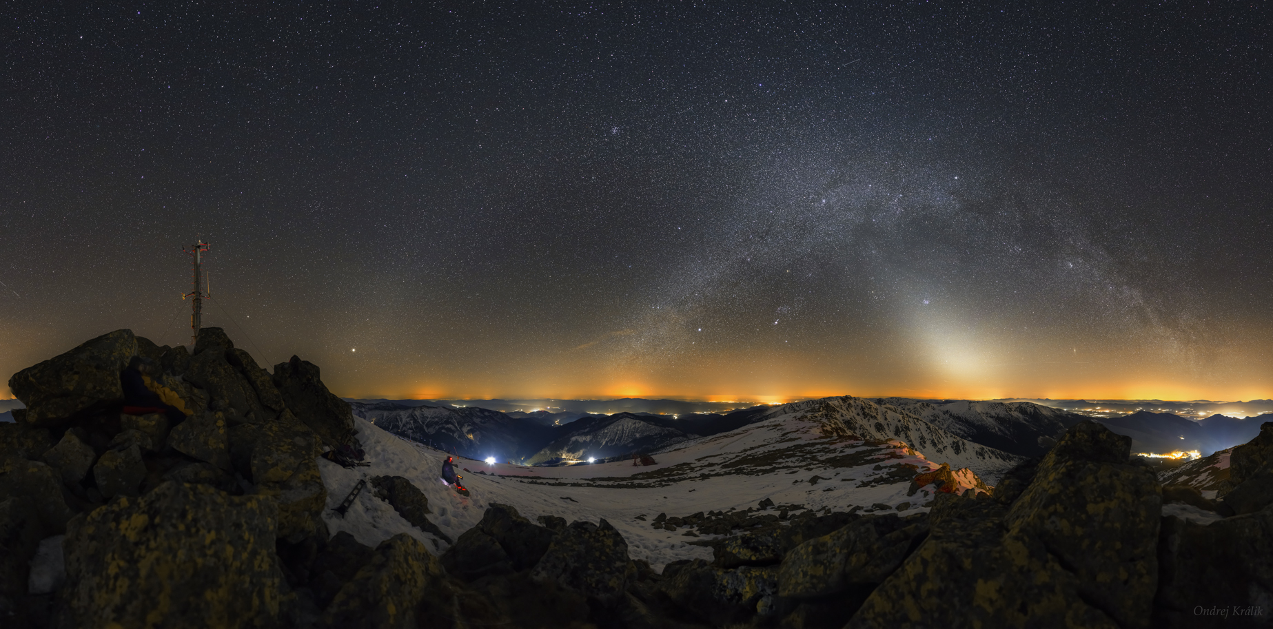 Two luminous arches stretched across the dome of the sky on this northern spring night. After sunset on March 29, the mountain view panorama was captured in 57 exposures from Chopok peak in central Slovakia at an altitude of about 2,000 meters. The arc of the northern Milky Way is visible toward the right, but only after it reaches above the terrestrial lights from the mountain top perspective. Though dusk has passed, a bright patch of celestial light still hovers near the horizon and fades into a second luminous arch of Zodiacal Light, crossing near the center of the Milky Way. Dust in the ecliptic plane reflects sunlight to create the Zodiacal glow, typically prominent after sunset in clear, dark, skies of the northern spring. Almost opposite the Sun, Jupiter shines brightly near the horizon toward the left. Since Jupiter lies near the ecliptic, it appears within the slight brightening of the Zodiacal band also opposite the Sun called the Gegenschein.