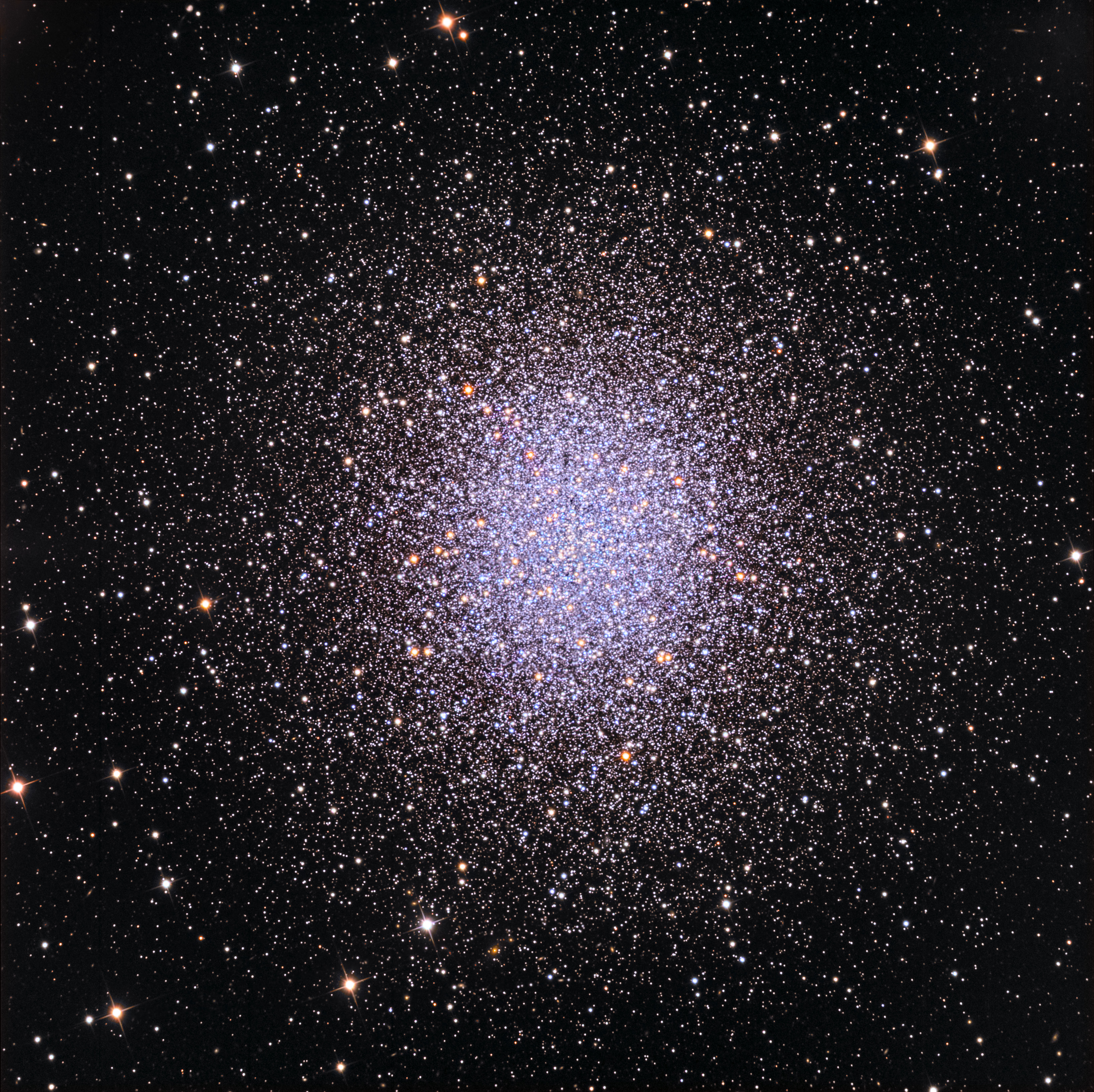 En 1716, el astrónomo inglés Edmond Halley observó: 'Este es solo un pequeño parche, pero se ve a simple vista cuando el cielo está despejado y la Luna no está presente'. Por supuesto, M13 ahora se reconoce con menos modestia como el Gran Cúmulo Globular en Hércules, uno de los cúmulos estelares globulares más brillantes del cielo del hemisferio norte. Las observaciones telescopicas revelan las espectaculares centenas de miles de estrellas que componen este cúmulo. A una distancia de 25.000 años luz, las estrellas del cúmulo se agrupan en una región de 150 años luz de diámetro. En la región central del cúmulo, se estima que más de 100 estrellas podrían estar contenidas en un cubo de solo 3 años luz de lado. Por comparación, la estrella más cercana al Sol se encuentra a más de 4 años luz. Junto con el núcleo denso del cúmulo, las regiones externas de M13 también se destacan en esta nítida imagen en color. Las estrellas gigantes evolucionadas de color rojo y azul del cúmulo aparecen con tonos amarillentos y azules.