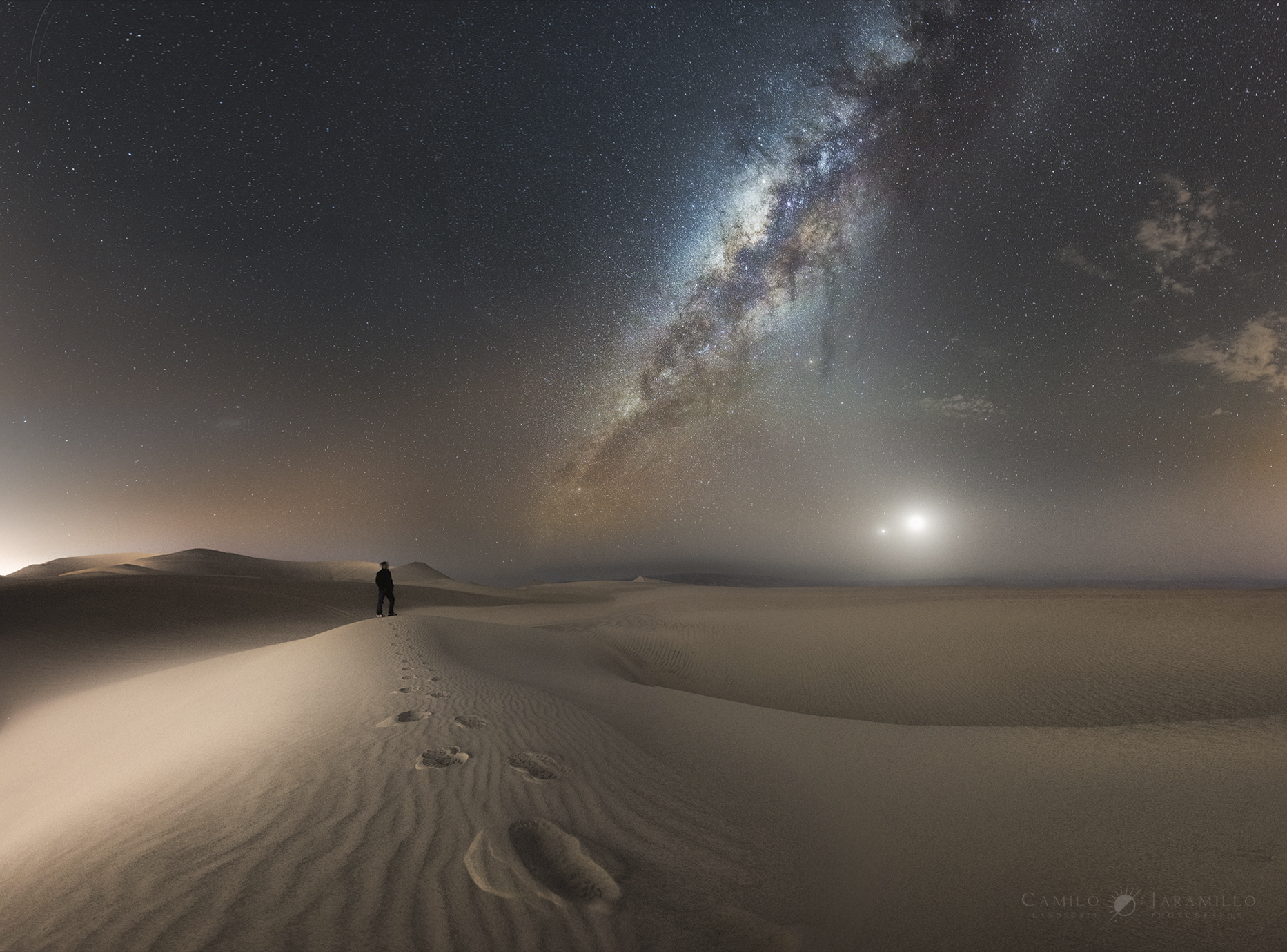 Una hermosa conjunción de Venus y la Luna, junto con elementos humanos, arena y la Vía Láctea, se muestra en este paisaje nocturno del cielo terrestre. La escena es un panorama compuesto por 6 fotografías tomadas en un momento cercano al final de un viaje. En primer plano, las huellas de pasos sobre las dunas agitadas por el viento están cerca de la oasi de Huacachina en el desierto del suroeste de Perú. Una perspectiva atractiva del mundo nocturno, la imagen final impresionante también fue elegida como ganadora en el Concurso Internacional de Fotografía Tierra y Cielo 2017 de The World at Night. Misión: Adiós Cassini
