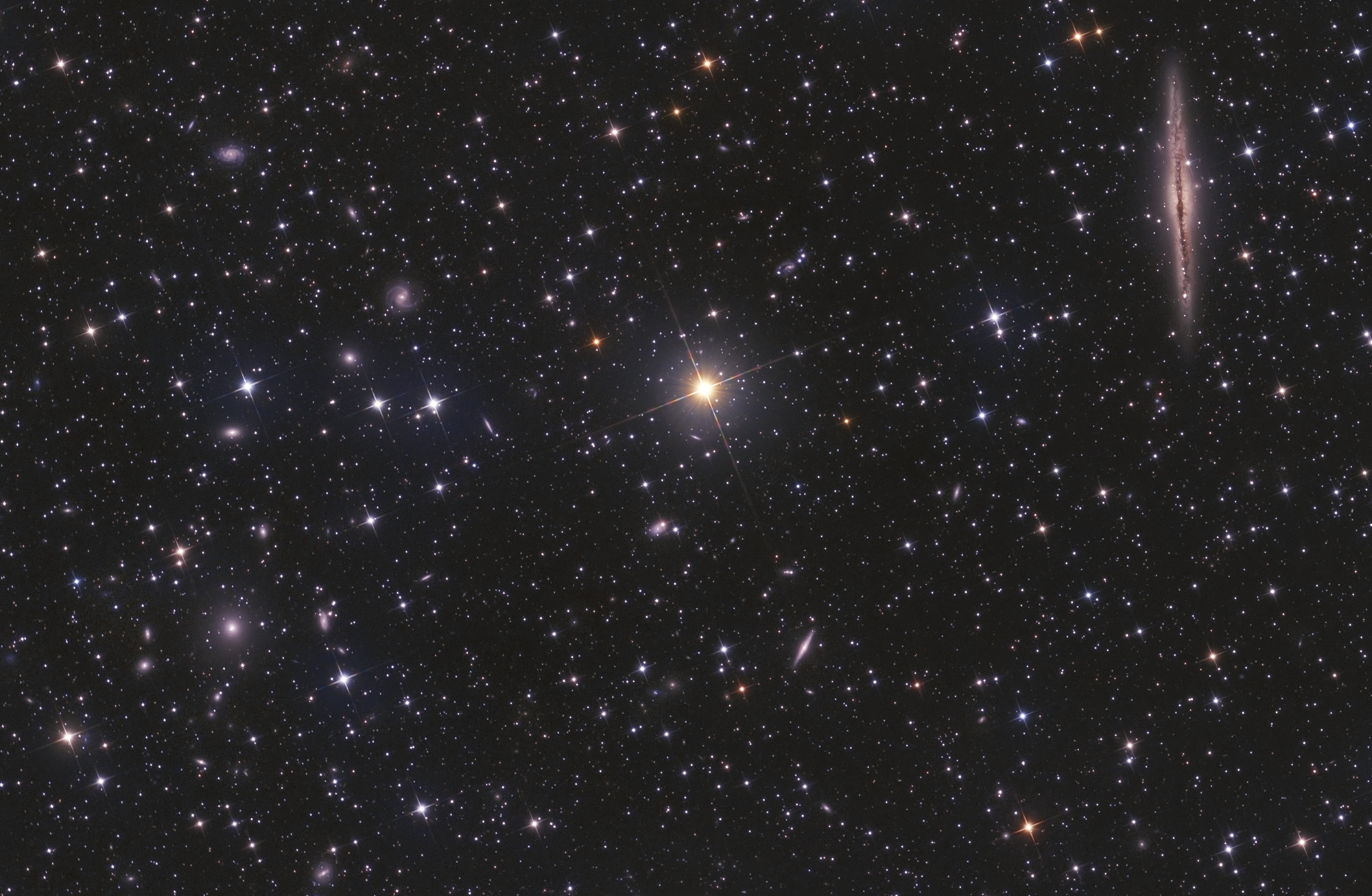 Galaxias distantes se encuentran más allá de un primer plano de estrellas espinosas de la Vía Láctea en este campo de visión telescópico. Centrada en la estrella amarilla HD 14771, la escena abarca aproximadamente 1 grado en el cielo hacia la constelación norteña de Andrómeda. En la parte superior derecha se encuentra la gran galaxia espiral NGC 891, que tiene 100 mil años luz de diámetro y se observa casi exactamente de perfil. A unos 30 millones de años luz de distancia, NGC 891 se parece mucho a nuestra propia Vía Láctea, con un disco galáctico aplanado y delgado. Su disco y su bulbo central están cortados por la mitad por nubes oscuras de polvo que lo ocultan. Dispersas hacia la parte inferior izquierda se encuentran miembros del cúmulo de galaxias Abell 347. A casi 240 millones de años luz de distancia, Abell 347 muestra sus propias grandes galaxias en la imagen nítida. Son similares a NGC 891 en tamaño físico, pero ubicadas casi 8 veces más lejos, por lo que las galaxias de Abell 347 tienen aproximadamente un octavo del tamaño aparente de NGC 891.