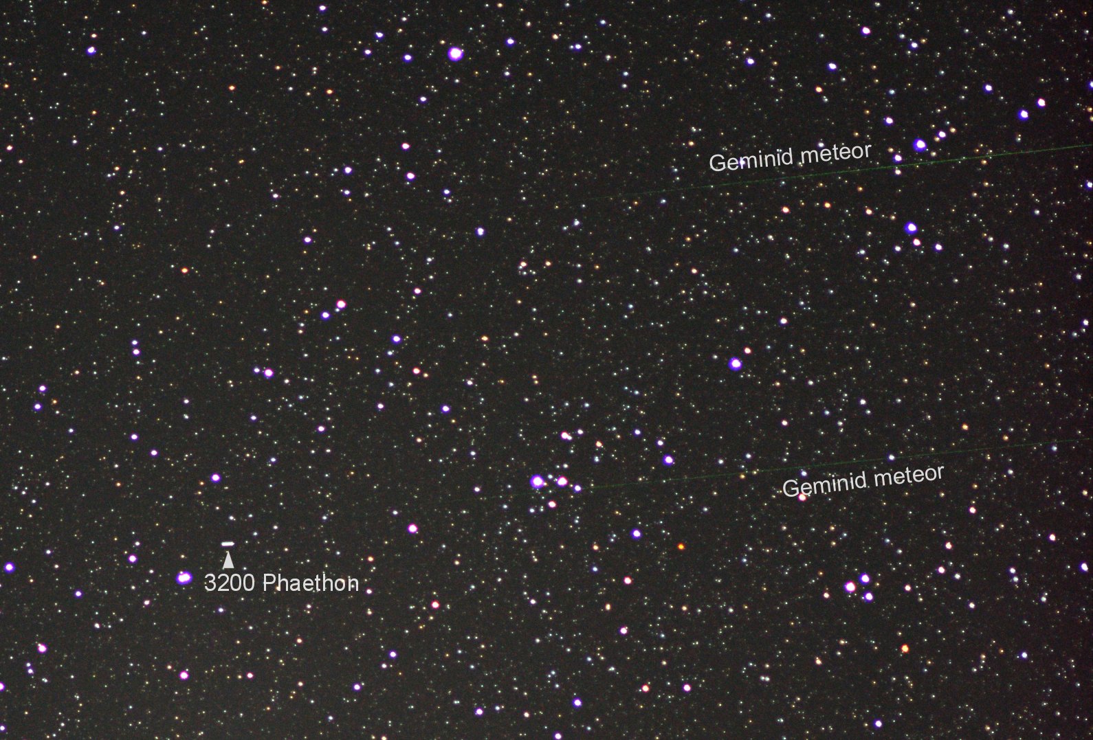 Basado en su órbita bien medida, el asteroide 3200 Phaethon (pronunciado FAY-eh-thon) es reconocido como la fuente del flujo de meteoroides responsable de la lluvia de meteoros anual de Géminidas. Aunque la mayoría de las lluvias de meteoros tienen como progenitores cometas, 3200 Phaethon es un asteroide cercano a la Tierra bien conocido y seguido de cerca, con un período orbital de 1.4 años. Rocoso y expuesto al calor del Sol, su perihelio, o punto más cercano al Sol, se encuentra bien dentro de la órbita del planeta Mercurio más interno. En este campo de visión telescópica, el rápido movimiento del asteroide contra las tenues estrellas de fondo de la constelación heroica de Perseo dejó una corta trayectoria durante el tiempo total de exposición de dos minutos. Las paralelas rayas de sus hijos meteoroides pasaron mucho más rápidamente por la escena. El retrato familiar fue capturado cerca del pico muy activo de la lluvia de meteoros de Géminidas el 13 de diciembre. Eso fue justo antes del histórico acercamiento más cercano de 3200 Phaethon a la Tierra el 16 de diciembre.