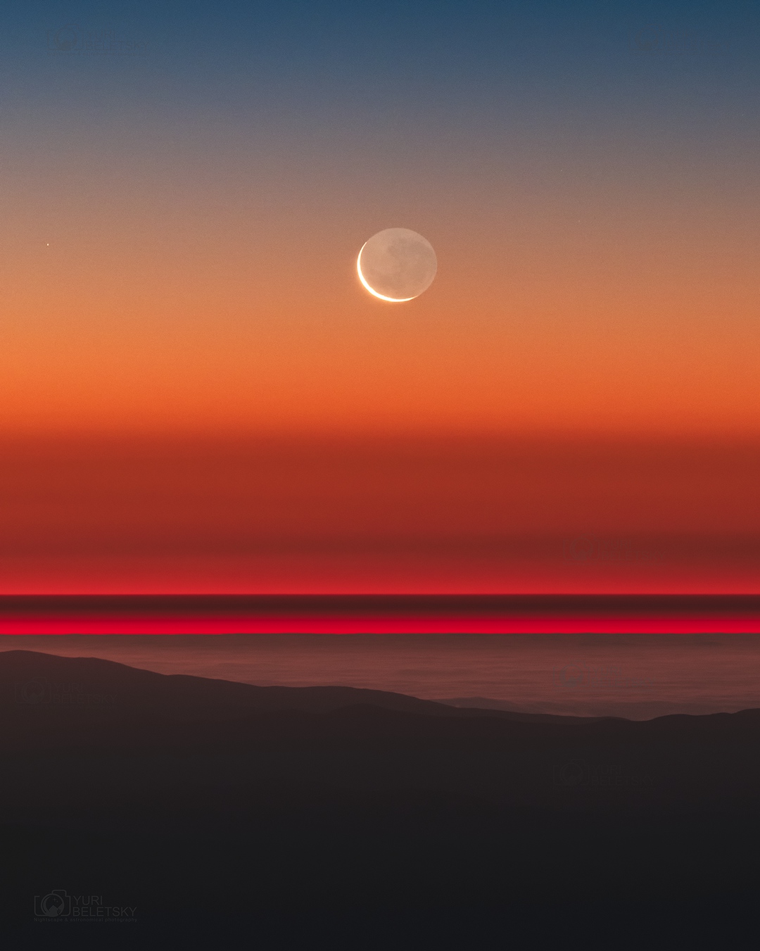 También conocido como el 'resplandor ceniciento' de la Luna o la 'Luna vieja en los brazos de la Luna nueva', el resplandor terrestre es la luz de la Tierra reflejada en el lado nocturno de la Luna. Esta asombrosa imagen del resplandor terrestre tomada desde una joven Luna creciente fue capturada desde el Observatorio Las Campanas, en el desierto de Atacama, Chile, en la Tierra, cerca del ocaso lunar el 18 de enero. Encima del océano Pacífico aparecen dramáticas capas de inversión atmosférica, teñidas por el atardecer en el horizonte occidental del planeta. Pero la vista desde la Luna también habría sido asombrosa. Cuando la Luna aparece en el cielo terrestre como un delgado creciente, desde la superficie lunar se vería una Tierra brillante y casi llena. Una descripción del resplandor terrestre, en términos de luz solar reflejada por los océanos de la Tierra que a su vez iluminan la superficie oscura de la Luna, fue escrita hace 500 años por Leonardo da Vinci.