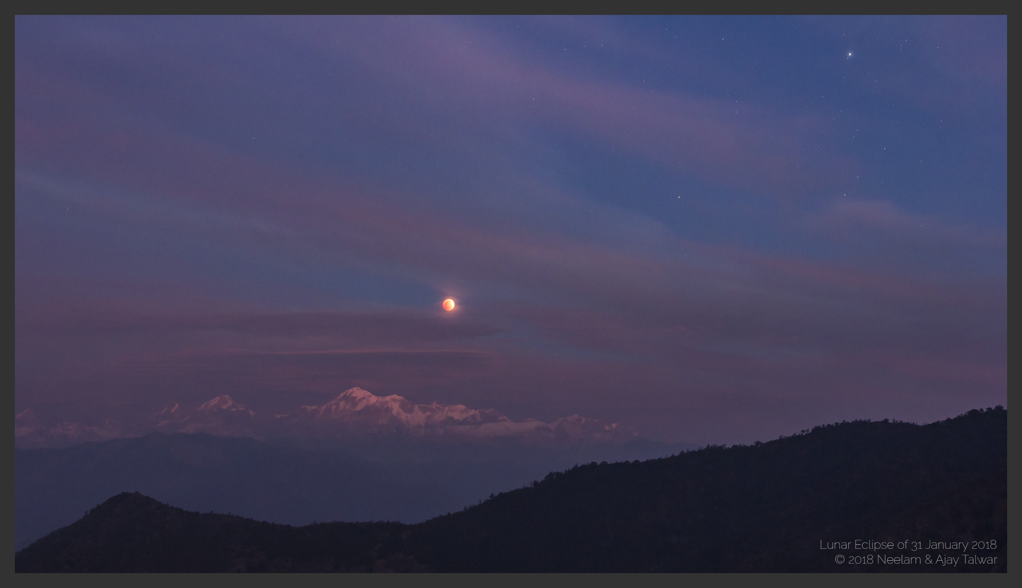 Esta imagen de la atmósfera captura un horizonte distante que se dirige hacia las altas cumbres de Trisul de las nevadas montañas himalayas de la India. Tomada desde un lugar remoto el 31 de enero, el brillante astro Proción brilla en la parte superior derecha. La Luna rojiza que se eleva se desplaza a través de la sombra de la Tierra durante el eclipse lunar total tan esperado de la noche. Disfrutado en el lado nocturno del planeta, el eclipse fue el primero de dos eclipses lunares totales en 2018, comenzando un buen año para los observadores de la Luna. Pero este fue un espectáculo raro. La Luna eclipsada también apareció grande cerca del perigeo, el punto más cercano de su órbita, durante la segunda Luna Llena del mes, también conocida como Luna Azul. Para el eclipse lunar total del 27 de julio de 2018, la Luna Llena estará muy cerca del apogeo.