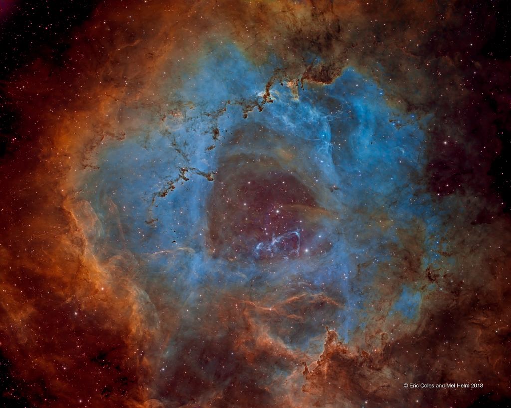 Crédito: NASA, ESA, y el equipo del Hubble Heritage (STScI/AURA) No todas las rosas son rojas, por supuesto, pero aún así pueden ser muy hermosas. Del mismo modo, la hermosa Nebulosa Roseta y otras regiones de formación estelar suelen mostrarse en imágenes astronómicas con un tono predominantemente rojo, en parte porque la emisión dominante en la nebulosa proviene de átomos de hidrógeno. La línea de emisión óptica más fuerte del hidrógeno, conocida como H-alfa, se encuentra en la región roja del espectro, pero la belleza de una nebulosa de emisión no necesita apreciarse únicamente en luz roja. Otros átomos en la nebulosa también son excitados por la luz energética de las estrellas y producen líneas de emisión estrechas. En esta hermosa imagen de la Nebulosa Roseta, se combinan imágenes en banda estrecha para mostrar la emisión de átomos de azufre en rojo, de hidrógeno en azul y de oxígeno en verde. De hecho, el esquema de mapear estas líneas de emisión atómica estrechas a colores más amplios se adopta en muchas imágenes del Hubble de nidos estelares. La imagen abarca aproximadamente 100 años luz en la constelación de Monoceros, a una distancia estimada de 3,000 años luz de la Nebulosa Roseta.