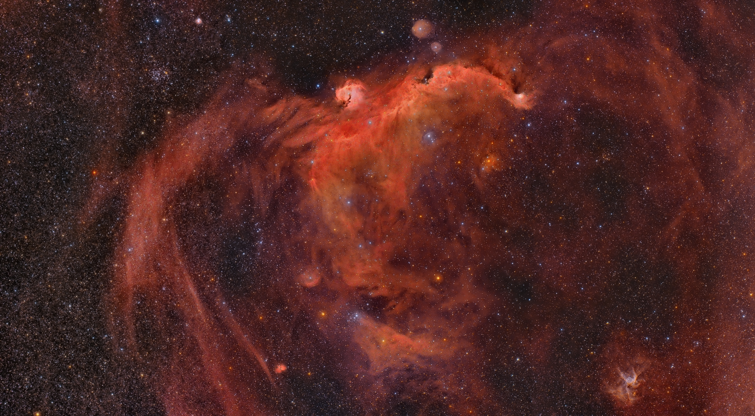 Seen as a seagull and a duck, these nebulae are not the only cosmic clouds to evoke images of flight. But both are winging their way across this broad celestial landscape, spanning almost 7 degrees across planet Earth's night sky toward the constellation Canis Major. The expansive Seagull (top center) is itself composed of two major cataloged emission nebulae. Brighter NGC 2327 forms the head with the more diffuse IC 2177 as the wings and body. Impressively, the Seagull's wingspan would correspond to about 250 light-years at the nebula's estimated distance of 3,800 light-years. At the lower right, the Duck appears much more compact and would span only about 50 light-years given its 15,000 light-year distance estimate. Blown by energetic winds from an extremely massive, hot star near its center, the Duck nebula is cataloged as NGC 2359. Of course, the Duck's thick body and winged appendages also lend it the slightly more dramatic popular moniker, Thor's Helmet.