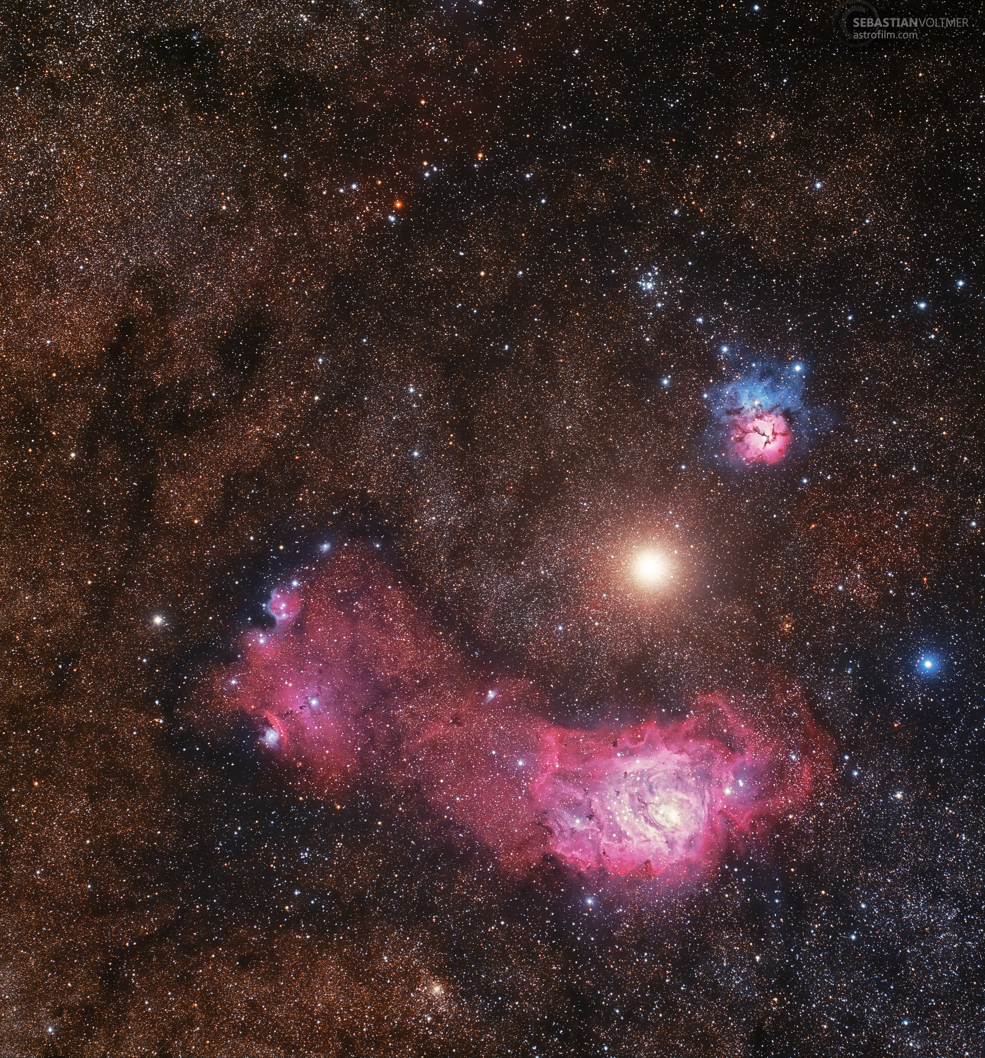 ¿Qué es ese punto rojizo brillante entre las nebulosas de la Laguna y Trífida? Marte. Esta hermosa fotografía de color capturó al planeta rojo pasando entre las dos nebulosas notables — catalogadas por el registrador cósmico del siglo XVIII Charles Messier como M8 y M20. M20 (superior derecha del centro), la nebulosa Trífida, presenta un contraste llamativo en colores rojo/azul y surcos oscuros de polvo. En la parte inferior derecha se extiende el atractivo resplandor rojizo de M8, la nebulosa de la Laguna. Ambas nebulosas se encuentran a unos pocos miles de años luz de distancia. En comparación, temporalmente situado entre ambas, se encuentra el dominante