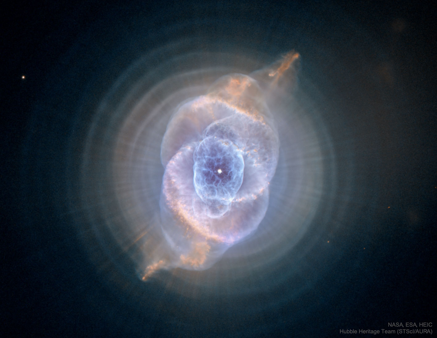 To some, it may look like a cat's eye. The alluring Cat's Eye nebula, however, lies three thousand light-years from Earth across interstellar space. A classic planetary nebula, the Cat's Eye (NGC 6543) represents a final, brief yet glorious phase in the life of a sun-like star. This nebula's dying central star may have produced the simple, outer pattern of dusty concentric shells by shrugging off outer layers in a series of regular convulsions. But the formation of the beautiful, more complex inner structures is not well understood. Seen so clearly in this digitally sharpened Hubble Space Telescope image, the truly cosmic eye is over half a light-year across. Of course, gazing into this Cat's Eye, astronomers may well be seeing the fate of our sun, destined to enter its own planetary nebula phase of evolution ... in about 5 billion years.