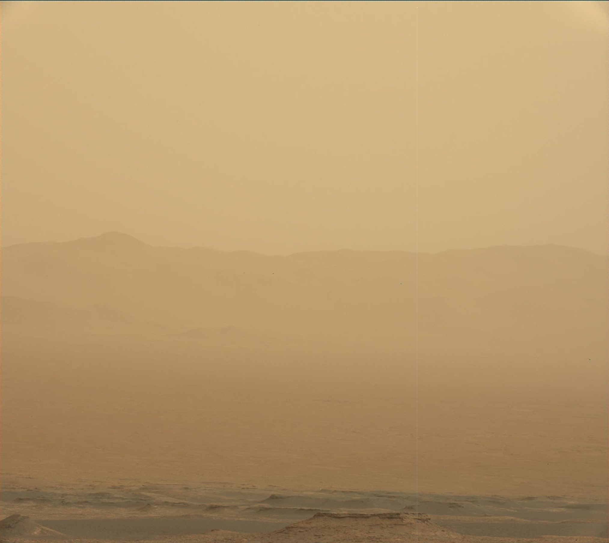 It's storm season on Mars. Dusty with a chance of dust is the weather report for Gale crater as a recent planet-scale dust storm rages. On June 10 looking toward the east-northeast crater rim about 30 kilometers away, the Curiosity rover's Mastcam captured this image of its local conditions so far. Meanwhile over 2,000 kilometers away, the Opportunity rover ceased science operations as the storm grew thicker at its location on the west rim of Endeavour crater, and has stopped communicating, waiting out the storm for now. Curiosity is powered by a radioisotope thermoelectric generator, but the smaller Opportunity rover uses solar panels to charge its batteries. For Opportunity, the increasingly severe lack of sunlight has caused its batteries to run low.