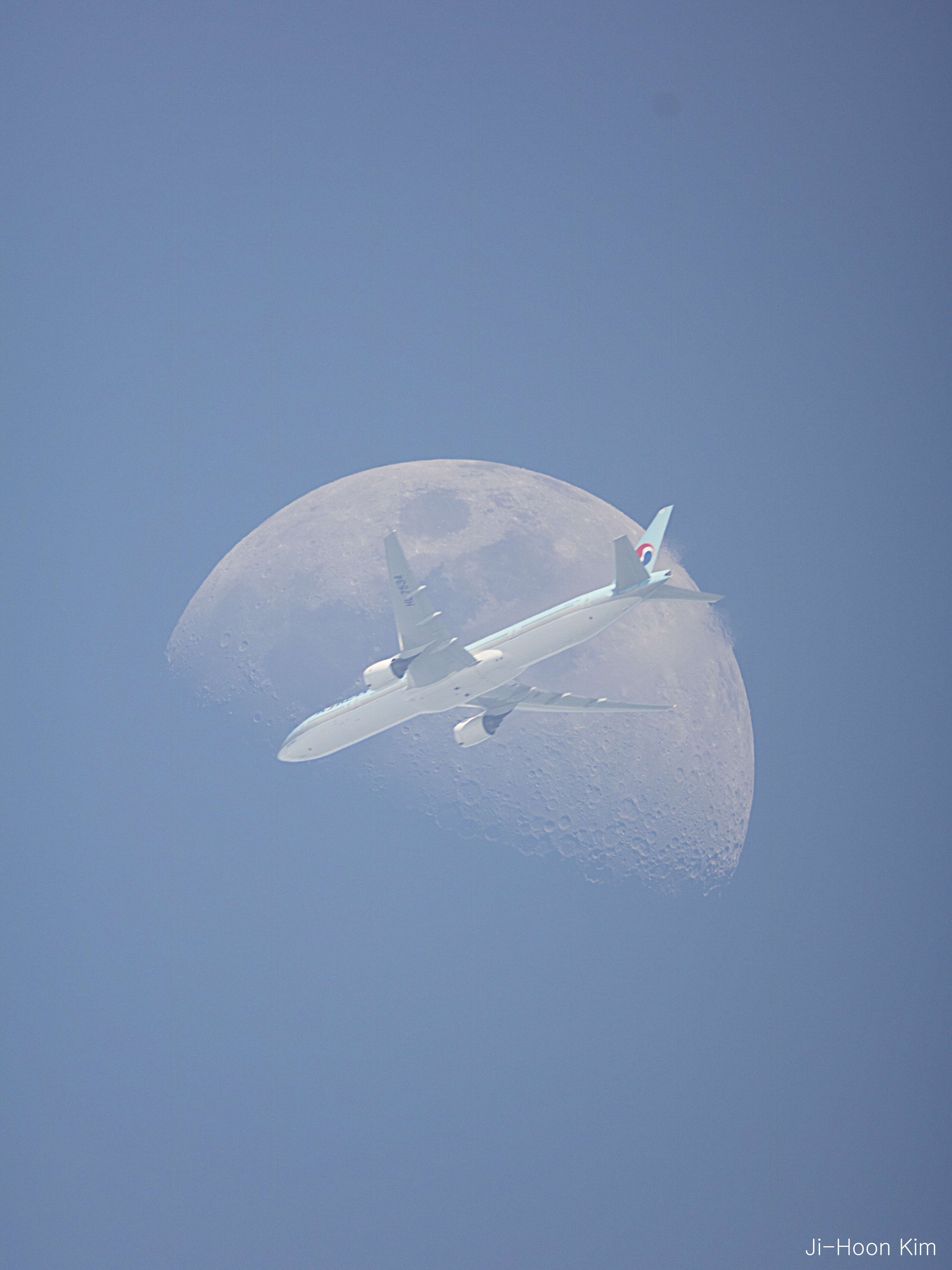 If you look closely at the Moon, you will see a large airplane in front of it. Well, not always. OK, hardly ever. Actually, to capture an image like this takes precise timing, an exposure fast enough to freeze the airplane and not overexpose the Moon -- but slow enough to see both, a steady camera, and luck -- because not every plane that approaches the Moon crosses in front. Helpful equipment includes a camera with fast continuous video mode and a mount that automatically tracks the Moon. The featured fleeting superposition was captured from Seoul, South Korea two weeks ago during a daytime waxing gibbous moonrise. Within 1/10th of a second, the airplane crossing was over. Follow APOD on: Facebook, Google Plus, Instagram, or Twitter