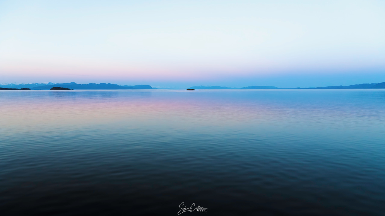 Al atardecer, mire hacia el este, no hacia el oeste. A medida que la sombra oscura de la Tierra asciende desde el horizonte oriental, aparecerán colores sutiles y tenues en dirección opuesta al Sol poniente. Esta hermosa escena marítima y celeste registra la escena reflejada desde una travesía por el bien transitado Inside Passage de Alaska en el noroeste del Pacífico. A lo largo del horizonte, el atardecer menguante cede lugar al arco rosáceo del anti-crepúsculo, más poéticamente conocido como el Cinturón de Venus. A menudo ignorado al atardecer en favor del horizonte occidental más brillante, el hermoso arco está teñido por la luz solar filtrada dispersada hacia atrás en la densa atmósfera, abrazando la sombra azul-grisácea ascendente del planeta.