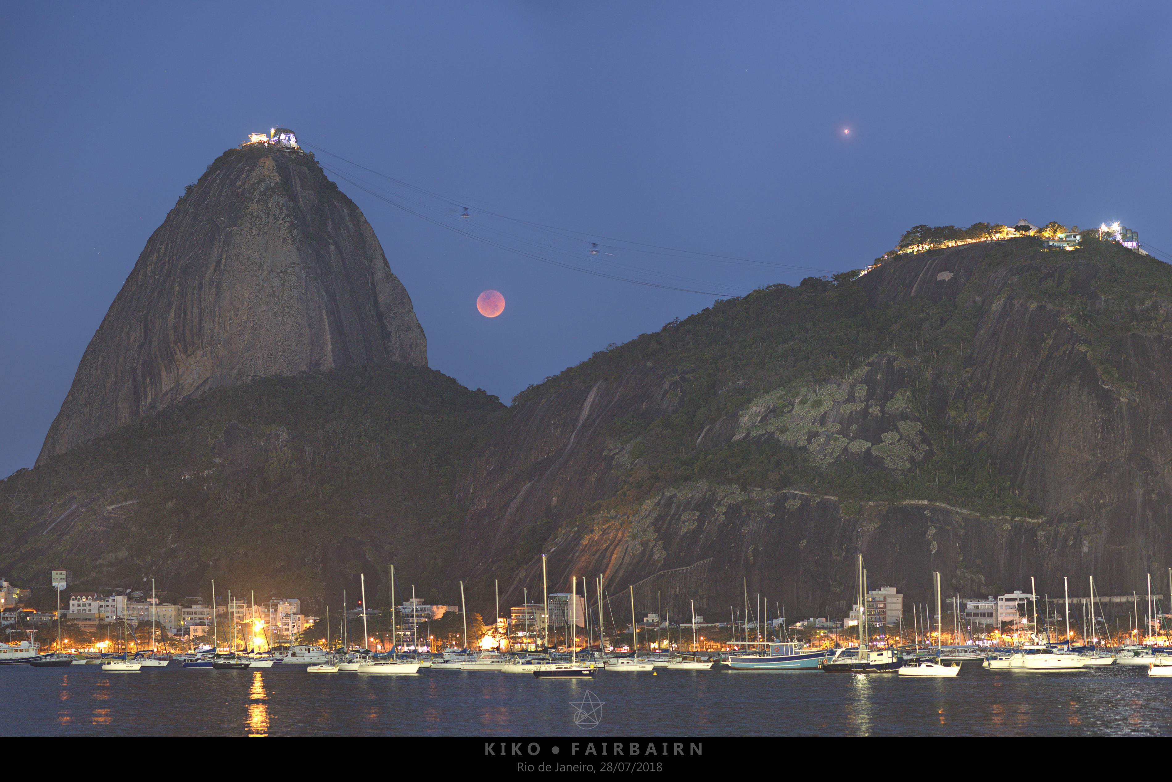 El amanecer de la luna no suele verse tan interesante. En primer lugar, la luna llena no suele verse tan oscura, pero el viernes pasado la luna se elevó aquí mientras pasaba simultáneamente por la sombra de la Tierra. En segundo lugar, la luna no suele verse tan rojiza, pero el viernes pasado estaba ligeramente iluminada por la luz solar rojiza que se refractó preferentemente a través de la atmósfera terrestre. Además, la luna no suele salir junto a un planeta, pero como Marte también estaba casi opuesto al Sol, el planeta rojo era visible a la derecha superior de la luna llena. Finalmente, desde el punto de vista de la mayoría de las personas, la luna no suele salir sobre Río de Janeiro en Brasil. Sin embargo, el eclipse de puesta de sol del viernes pasado, específicamente su notable Eclipse Lunar Total de Sangre Micro, fue capturado desde la playa de Botofogo en Río, junto con una multitud inusualmente grande de observadores interesados.