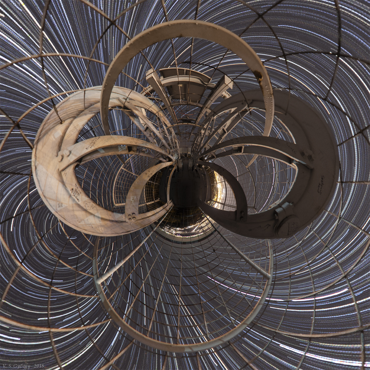 Don't panic. This little planet projection looks confusing, but it's actually just a digitally warped and stitched, nadir centered mosaic of images that covers nearly 360x180 degrees. The images were taken on the night of October 31 from a 30 meter tall hill-top lookout tower near Tatabanya, Hungary, planet Earth. The laticed lookout tower construction was converted from a local mine elevator. Since planet Earth is rotating, the 126 frames of 75 second long exposures also show warped, concentric star trails with the north celestial pole at the left. Of course at this location the south celestial pole is just right of center but below the the little planet's horizon.