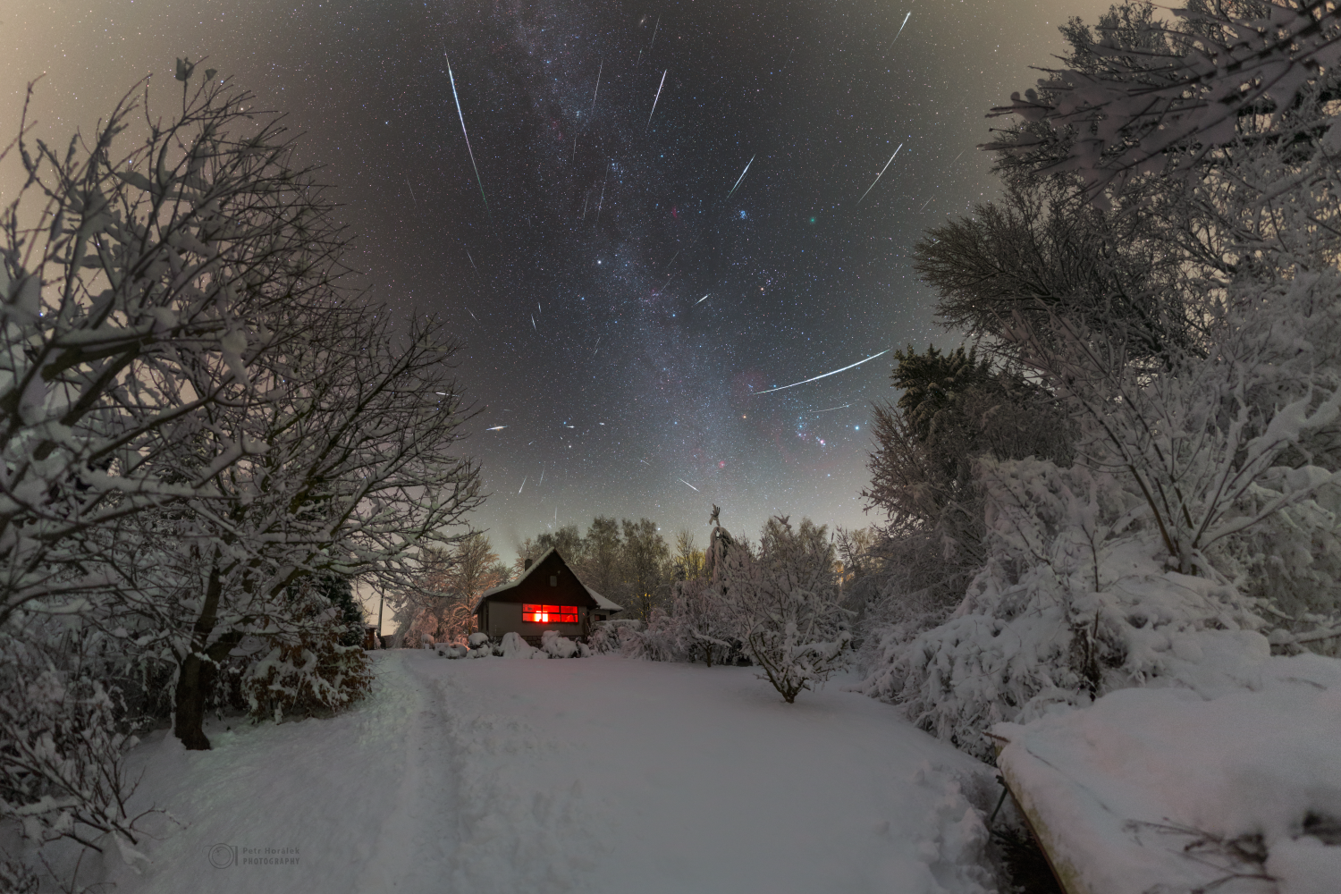 They say Orion always comes up sideways, and he does seem to on this cold December night. The bright stars of the familiar northern winter constellation lie just above the snowy tree tops surrounding a cozy cottage near the town of Ustupky in the Czech Republic. But Gemini's meteors also seem to rain on the wintry landscape. The meteor streaks are captured in exposures made near last Friday's peak of the annual Geminid meteor shower. They stream away from the shower's radiant above the trees, near the two bright stars of the zodiacal constellation of the Twins. Comet Wirtanen, a visitor to planet Earth's skies, is visible too. Look for its telltale greenish coma near the stars of the seven sisters.