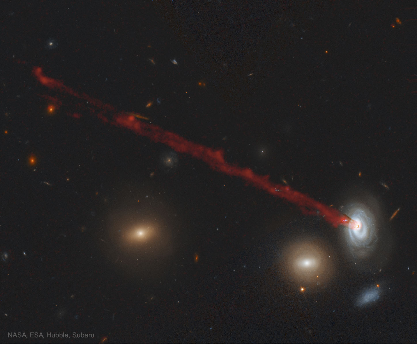 Why is there long red streak attached to this galaxy? The streak is made mostly of glowing hydrogen that has been systematically stripped away as the galaxy moved through the ambient hot gas in a cluster of galaxies. Specifically, the galaxy is spiral galaxy D100, and cluster is the Coma Cluster of galaxies. The red path connects to the center of D100 because the outer gas, gravitationally held less strongly, has already been stripped away by ram pressure. The extended gas tail is about 200,000 light-years long, contains about 400,000 times the mass of our Sun, and stars are forming within it. Galaxy D99, visible to D100's lower left, appears red because it glows primarily from the light of old red stars -- young blue stars can no longer form because D99 has been stripped of its star-forming gas. The featured false-color picture is a digitally enhanced composite of images from Earth-orbiting Hubble and the ground-based Subaru telescope. Studying remarkable systems like this bolsters our understanding of how galaxies evolve in clusters.