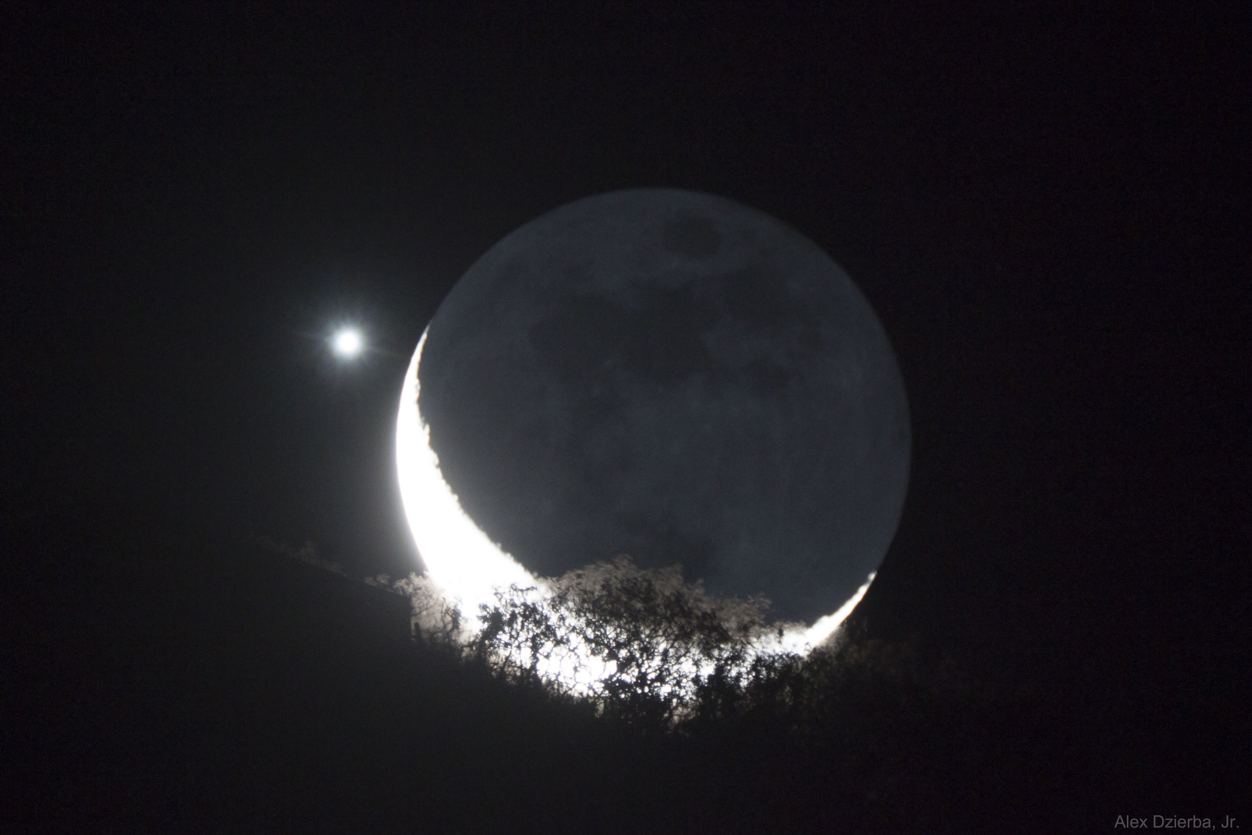What's that bright spot near the Moon? Venus. About a week ago, Earth's Moon appeared unusually close to the distant planet Venus, an angular coincidence known as an appulse. Similar to a conjunction, which is a coordinate term, an appulse refers more generally to when two celestial objects appear close together. This Moon and Venus appulse -- once as close as 0.05 degrees -- was captured rising during the early morning behind Koko crater on the island of O'ahu in Hawaii, USA. The Moon was in a crescent phase with its lower left reflecting direct sunlight, while the rest of the Moon is seen because of Earthshine, sunlight first reflected from the Earth. Some leaves and branches of a foreground kiawe tree are seen in silhouette in front of the bright crescent, while others, in front of a darker background, appear white because of forward scattering. Appulses involving the Moon typically occur several times a year: for example the Moon is expected to pass within 0.20 degrees of distant Saturn on March 1.