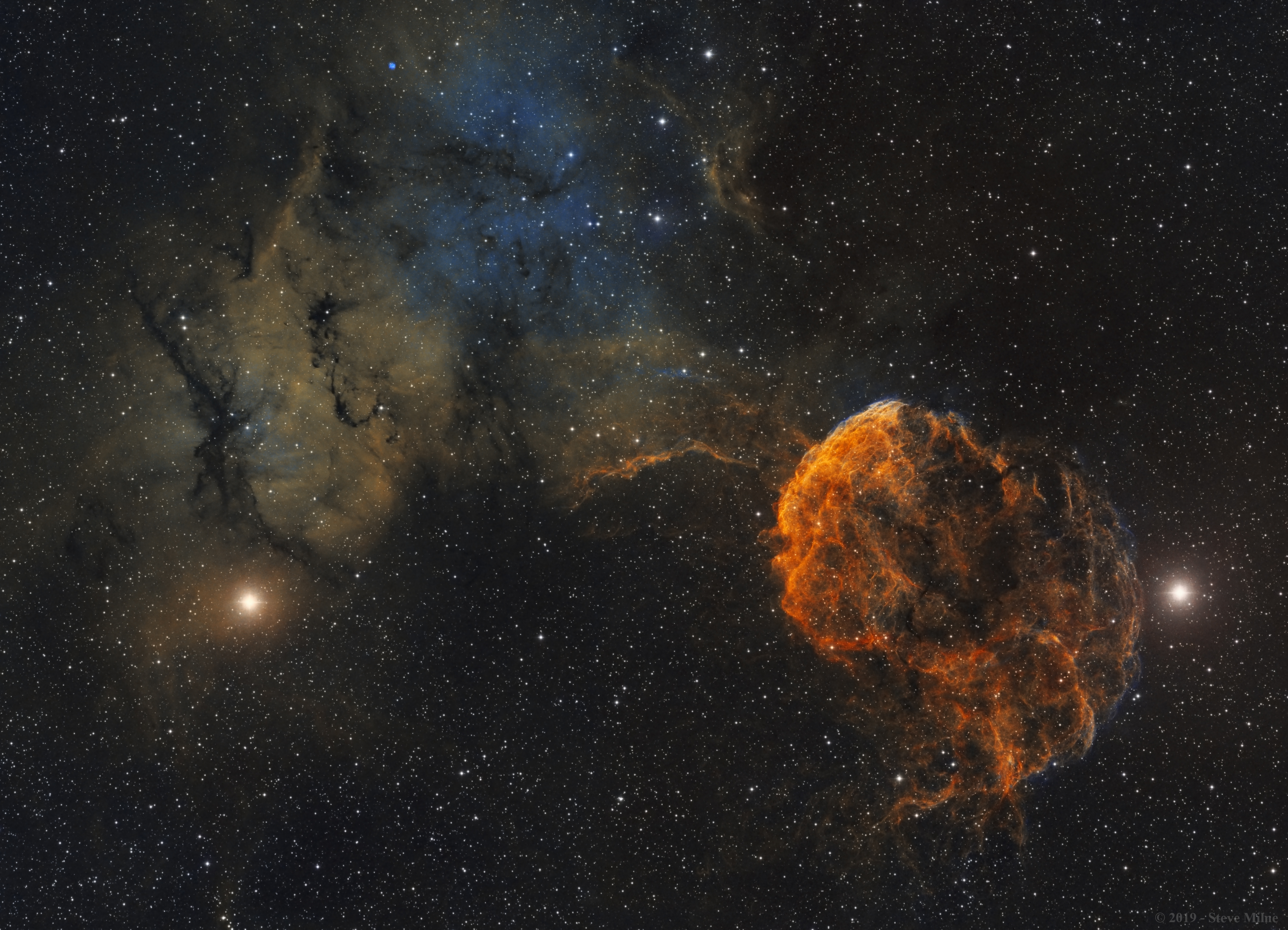Normally faint and elusive, the Jellyfish Nebula is caught in this alluring telescopic field of view. The entire scene is a two panel mosaic constructed using narrowband image data, with emission from sulfur, hydrogen and oxygen atoms shown in red, green and blue hues. It's anchored right and left by two bright stars, Mu and Eta Geminorum, at the foot of the celestial twin. The Jellyfish Nebula itself is right of center, the brighter arcing ridge of emission with dangling tentacles. In fact, the cosmic jellyfish is part of bubble-shaped supernova remnant IC 443, the expanding debris cloud from a massive star that exploded. Light from the explosion first reached planet Earth over 30,000 years ago. Like its cousin in astrophysical waters the Crab Nebula supernova remnant, the Jellyfish Nebula is known to harbor a neutron star, the remnant of the collapsed stellar core. An emission nebula cataloged as Sharpless 249 fills the field at the upper left. The Jellyfish Nebula is about 5,000 light-years away. At that distance, this image would be about 300 light-years across.