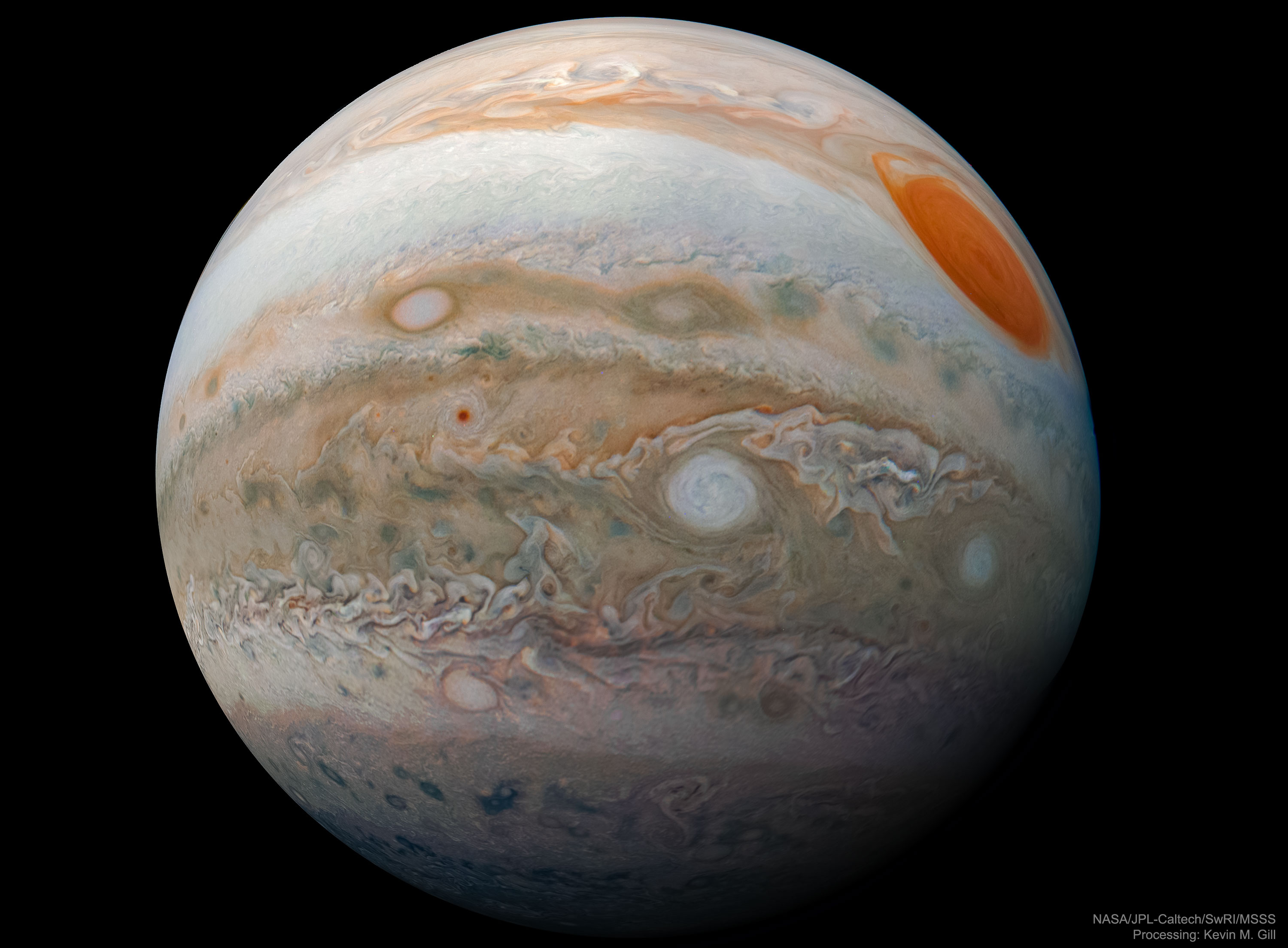 What does Jupiter look like up close? Most images of Jupiter are taken from far away, either from Earth or from a great enough distance that nearly half the planet is visible. This shot, though, was composed from images taken relatively close in, where less than half of the planet was visible. From here, Jupiter still appears spherical but perspective distortion now makes it look more like a marble. Visible on Jupiter's cloud tops are a prominent dark horizontal belt containing a white oval cloud, and a white zone cloud, both of which circle the planet. The Great Red Spot looms on the upper right. The featured image was taken by the robotic Juno spacecraft in February during its 17th close pass of our Solar System's largest planet. Juno's mission, now extended into 2021, is to study Jupiter in new ways. Juno's data has already enabled discoveries that include Jupiter's magnetic field being surprisingly lumpy, and that some of Jupiter's cloud systems run about 3,000 kilometers into the planet.