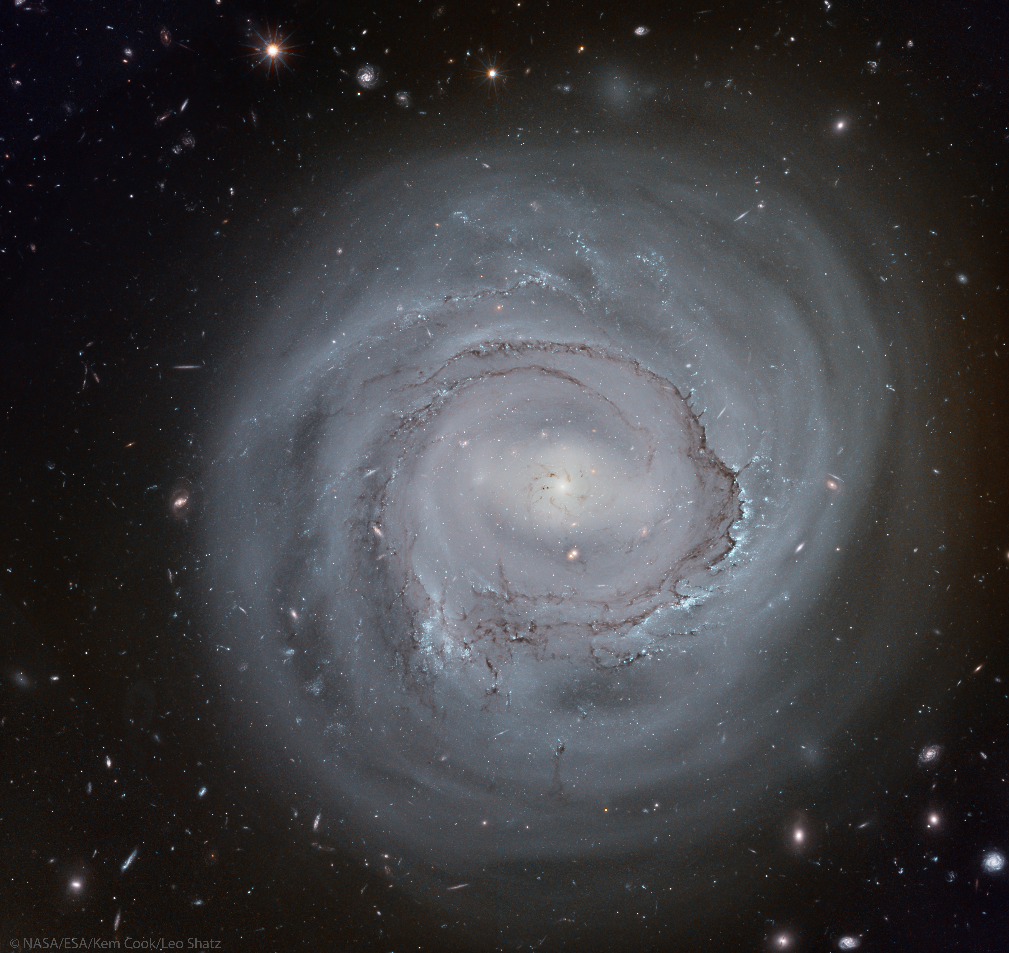 ¿A qué distancia se encuentra la galaxia espiral NGC 4921? Es sorprendentemente importante saberlo. Aunque actualmente se estima que se encuentra a unos 300 millones de años luz de distancia, una determinación más precisa podría combinarse con su velocidad de recesión conocida para ayudar a la humanidad a calibrar mejor la tasa de expansión del universo visible completo. Con este objetivo, se tomaron varias imágenes con el Telescopio Espacial Hubble con el fin de identificar marcadores clave de distancia estelar conocidos como estrellas variables Cefeidas. Dado que NGC 4921 es miembro del Cúmulo de Galaxias Coma, refinar su distancia también permitiría una mejor determinación de la distancia a uno de los cúmulos más grandes cercanos del universo local. La magnífica espiral NGC 4921 ha sido informalmente apodada anémica debido a su baja tasa de formación estelar y su baja luminosidad superficial. En la imagen destacada se ven, desde el centro, un núcleo brillante, una barra central brillante, un anillo prominente de polvo oscuro, cúmulos azules de estrellas recientemente formadas, varias galaxias compañeras más pequeñas, galaxias no relacionadas en el universo muy distante, y estrellas no relacionadas en nuestra Vía Láctea.