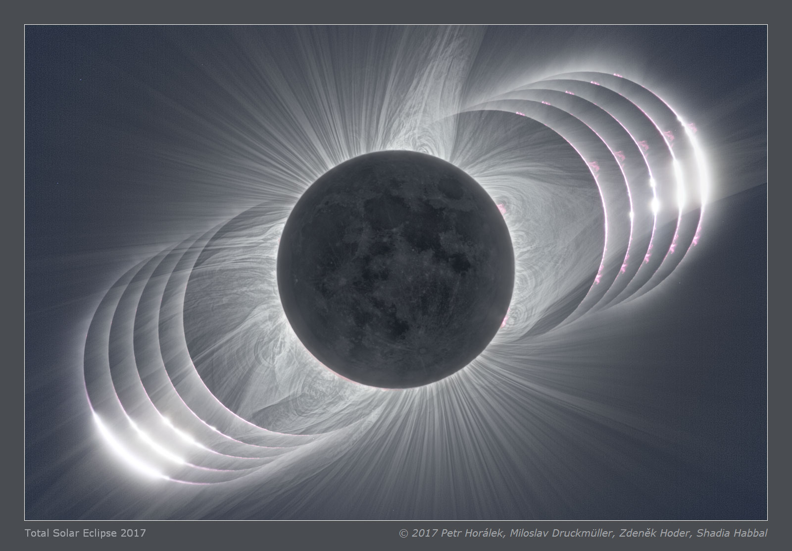 Most photographs don't adequately portray the magnificence of the Sun's corona. Seeing the corona first-hand during a total solar eclipse is unparalleled. The human eye can adapt to see coronal features and extent that average cameras usually cannot. Welcome, however, to the digital age. The featured central image digitally combined short and long exposures that were processed to highlight faint and extended features in the corona of the total solar eclipse that occurred in August of 2017. Clearly visible are intricate layers and glowing caustics of an ever changing mixture of hot gas and magnetic fields in the Sun's corona. Looping prominences appear bright pink just past the Sun's limb. Faint details on the night side of the New Moon can even be made out, illuminated by sunlight reflected from the dayside of the Full Earth. Images taken seconds before and after the total eclipse show glimpses of the background Sun known as Baily's Beads and Diamond Ring. Tomorrow, a new total solar eclipse will be visible from parts of South America.
