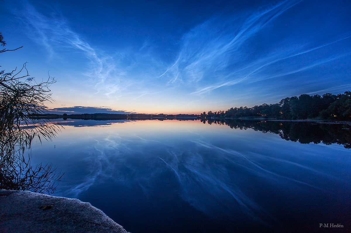 Transfusing sunlight through a still dark sky, this exceptional display of noctilucent clouds was captured earlier this month, reflected in the calm waters of Vallentuna Lake near Stockholm, Sweden. From the edge of space, about 80 kilometers above Earth's surface, the icy clouds themselves still reflect sunlight even though the Sun is below the horizon as seen from the ground. Usually spotted at high latitudes in summer months the night shining clouds have made a strong showing so far during the short northern summer nights. Also known as polar mesopheric clouds they are understood to form as water vapor driven into the cold upper atmosphere condenses on the fine dust particles supplied by disintegrating meteors or volcanic ash. NASA's AIM mission provides daily projections of noctilucent clouds as seen from space.
