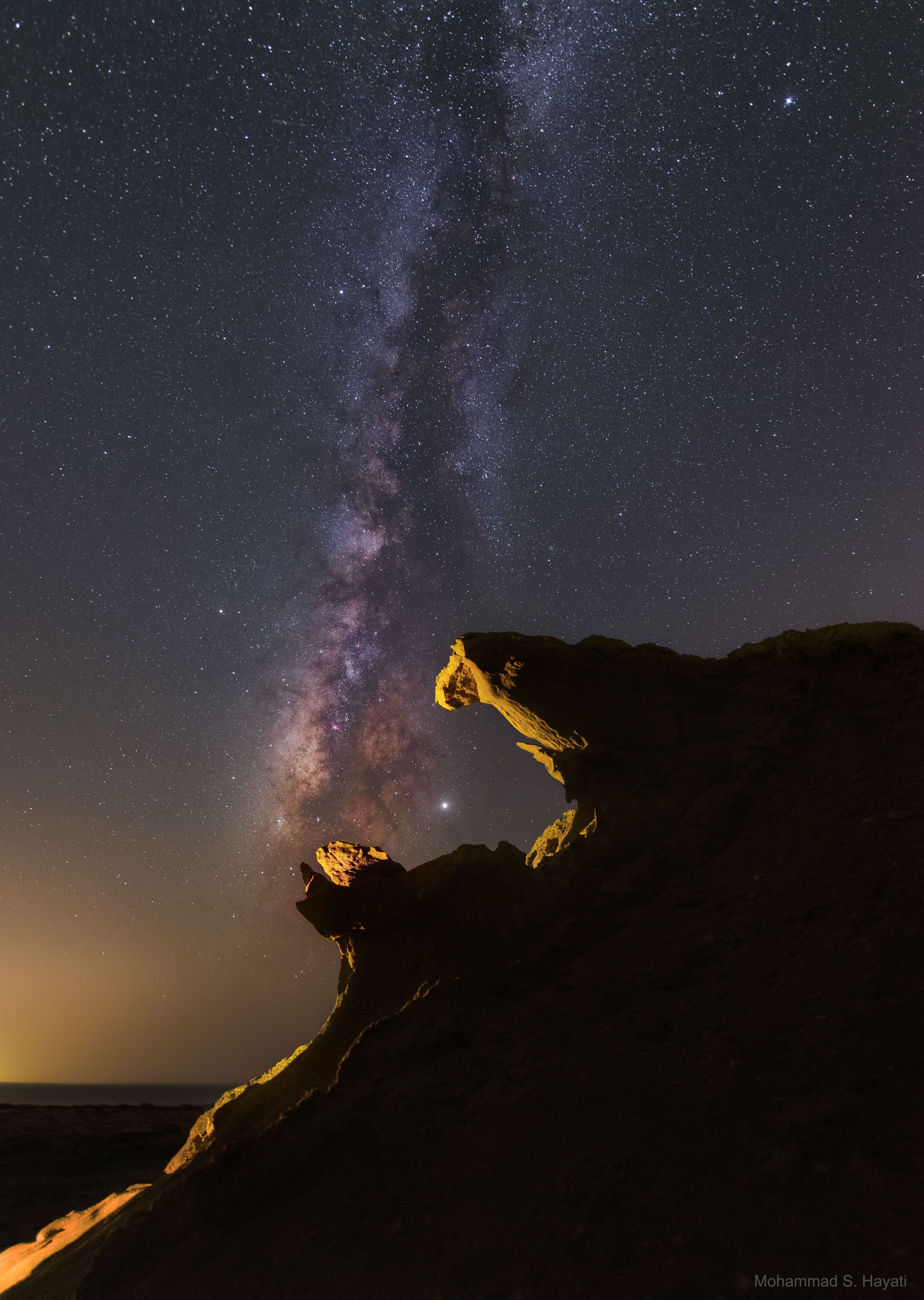 This is a good month to see Jupiter. To find our Solar System's largest planet in your sky, look toward the southeast just after sunset -- Jupiter should be the brightest object in that part of the sky. If you have a binoculars or a small telescope, you should be able to see Jupiter's four brightest moons right nearby, and possibly some cloud bands. The featured image was taken about a month ago from the Persian Gulf. The image shows Jupiter just to the right of the nearly vertical band of the central disk of our Milky Way Galaxy. The unnamed rock formations appear in projection like the jaws of a giant monster ready to engulf the Jovian giant. When you see Jupiter, it may be interesting to know that NASA's robotic Juno spacecraft is simultaneously visiting and studying the giant planet. Saturn is also visible this month, and although it is nearby to Jupiter, it is not as bright.
