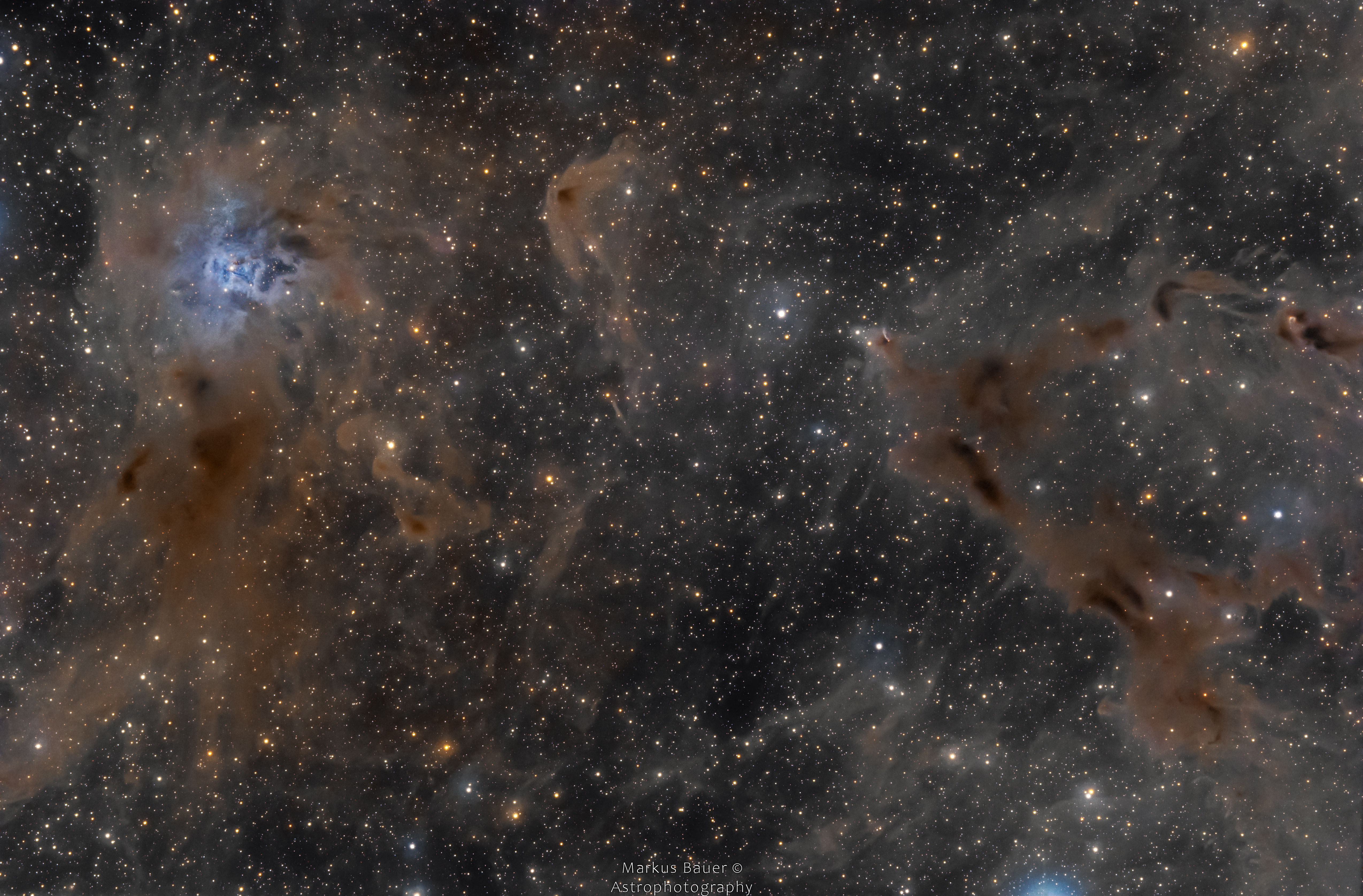 Estas nubes de polvo cósmico se desplazan a unos 1.300 años luz de distancia, a lo largo de los fértiles campos estelares de la constelación de Cefeo. La hermosa Nebulosa Iris, también conocida como NGC 7023, florece en la parte superior izquierda. No es la única nebulosa en el cielo que evoca la imagen de flores, su forma bonita y simétrica abarca aproximadamente 6 años luz. El color dominante azul de esta nebulosa es característico de los granos de polvo omnipresentes que reflejan la luz de una estrella cercana, caliente y azul. Pero nubes oscuras de polvo que ocultan la visión cubren la mayor parte del campo de visión de casi 4 grados de ancho. A la derecha se encuentra el complejo LDN 1147/1158 de las Nebulosas Oscuras de Lynds. Allí se están formando estrellas, aún ocultas dentro de los núcleos de las nubes oscuras. Una búsqueda a través de la imagen nítida puede identificar objetos Herbig-Haro, chorros de gas brillante y comprimido emanando de estrellas recientemente formadas.