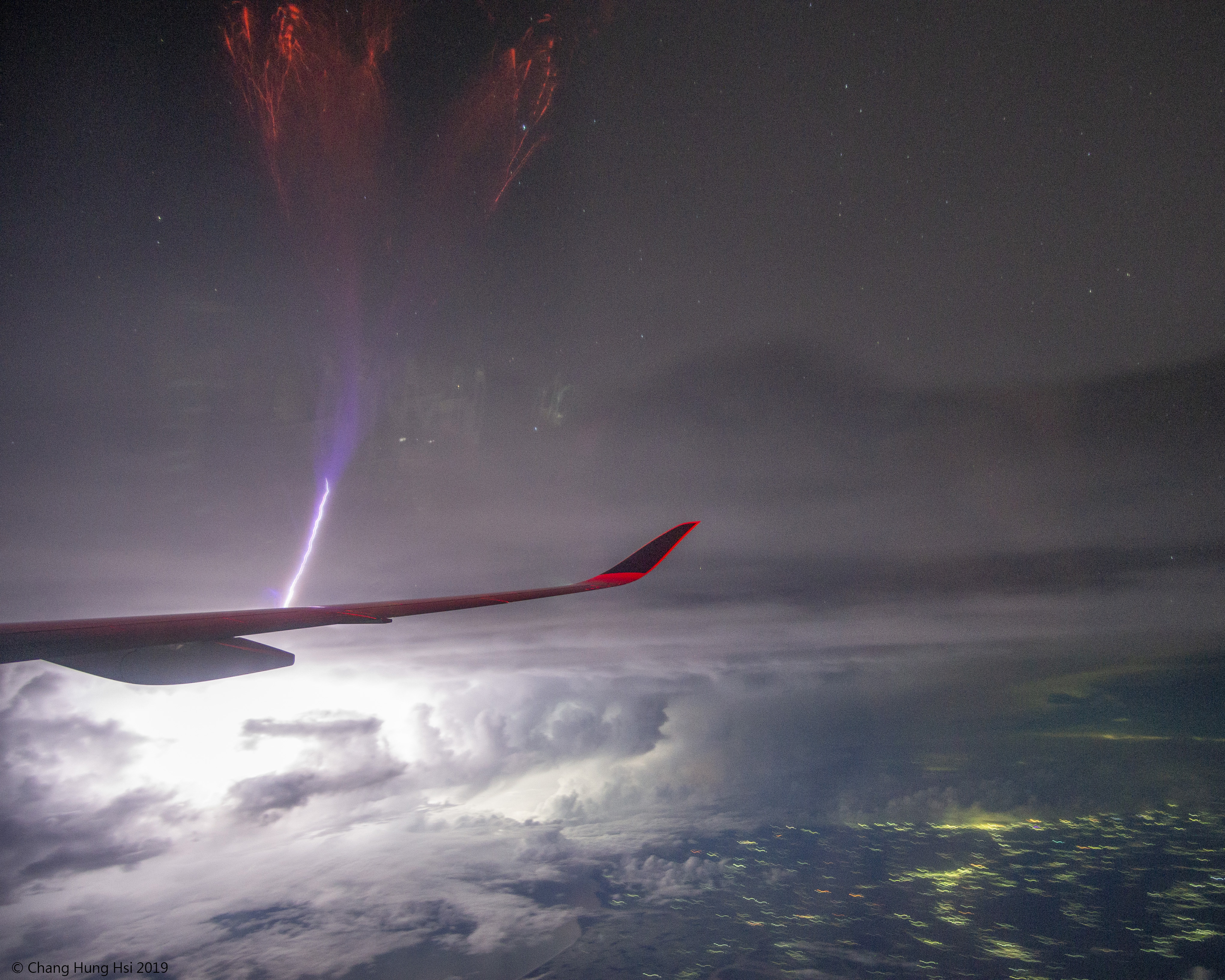 Sí, pero ¿puede tu relámpago hacer esto? Mientras volaba de Múnich a Singapur a principios de este mes, un pasajero emprendedor tomó imágenes de una tormenta eléctrica en movimiento y capturó algo inesperado: un rayo de chorro gigante. El chorro fue capturado en una única exposición de 3,2 segundos sobre Bhadrak, en la India. Aunque el rayo gigante parece conectado con el ala del avión, probablemente comenzó en una nube de tormenta más distante, y se puede ver extendiéndose hacia arriba hacia la ionosfera terrestre. La naturaleza de los rayos de chorro gigantes y su posible asociación con otros tipos de Eventos Luminosos Transitorios (TLE, por sus siglas en inglés), como los cheros azules y los espíritus rojos, sigue siendo un tema activo de investigación.