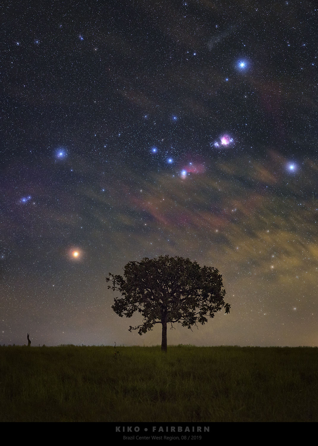 Have you seen Orion lately? The next few months will be the best for seeing this familiar constellation as it rises continually earlier in the night. However, Orion's stars and nebulas won't look quite as colorful to the eye as they do in this fantastic camera image. In the featured image, Orion was captured by camera showing its full colors last month over a Brazilian copal tree from Brazil's Central-West Region. Here the cool red giant Betelgeuse takes on a strong orange hue as the brightest star on the far left. Otherwise, Orion's hot blue stars are numerous, with supergiant Rigel balancing Betelgeuse at the upper right, Bellatrix at the upper left, and Saiph at the lower right. Lined up in Orion's belt (bottom to top) are Alnitak, Alnilam, and Mintaka all about 1,500 light-years away, born of the constellation's well studied interstellar clouds. And if a "star" toward the upper right Orion's sword looks reddish and fuzzy to you, it should. It's the stellar nursery known as the Great Nebula of Orion.