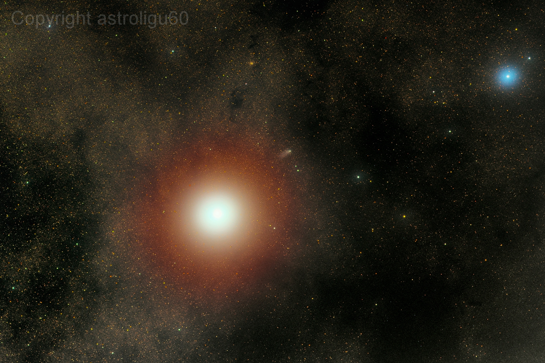October 31, 1938 was the day after Martians encountered planet Earth, and everything was calm. Reports of the invasion were revealed to be part of a Halloween radio drama, the now famous broadcast based on H.G. Wells' scifi novel War of the Worlds. On Mars October 20, 2014 was calm too, the day after its close encounter with Comet Siding Spring (C/2013 A1). Not a hoax, this comet really did come within 86,700 miles or so of Mars, about 1/3 the Earth-Moon distance. Earth's spacecraft and rovers in Mars orbit and on the surface reported no ill effects though, and had a ringside seat as a visitor from the outer solar system passed by. Spanning over 2 degrees against stars of the constellation Ophiuchus, this colorful telescopic snapshot captures our view of Mars on the day after. Bluish star 51 Ophiuchi is at the upper right and the comet is just emerging from the Red Planet's bright glare.