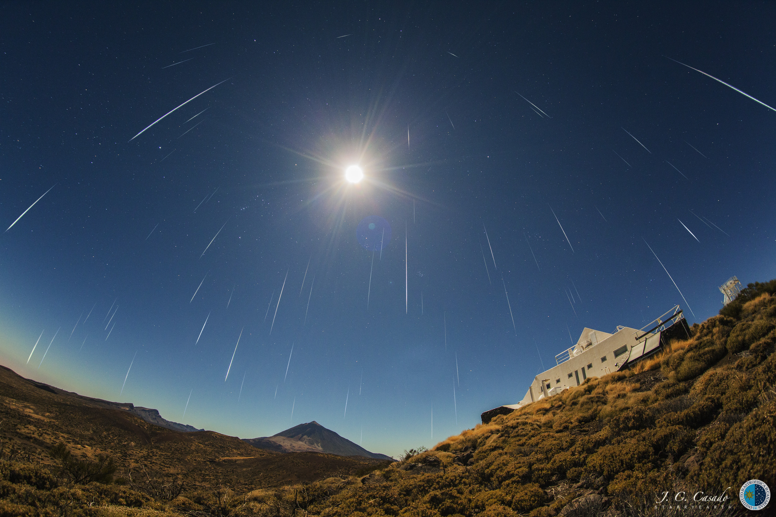 La confiable lluvia anual de meteoros Geminidas alcanzará su máximo esta noche (13/14 de diciembre) y antes del amanecer de mañana. Mientras la Tierra cruza por el rastro polvoriento del asteroide activo 3200 Phaethon, los meteoros brillarán en el cielo desde el radiante de la lluvia en la constelación de Géminis. Géminis también será bastante fácil de localizar para los observadores, ya que no estará muy lejos de una Luna menguante casi llena. No es necesario mirar directamente al radiante de la lluvia para ver los meteoros. La luz casi plena de la Luna no ocultará los meteoros más brillantes de las Geminidas, pero sí reducirá considerablemente la tasa de meteoros visibles para quienes los cuentan. De hecho, las Geminidas de 2019 deberían verse muy similares a la lluvia de meteoros de 2016. Esta imagen compuesta de las Geminidas de 2016 alinea exposiciones cortas individuales para capturar muchos de los meteoros más brillantes de las Geminidas, a pesar de que una Luna Llena brillaba cerca de la constelación de los Gemelos. A lo largo del horizonte se encuentran el Laboratorio Solar del Observatorio del Teide (a la derecha) y el volcán del Teide en la isla canaria de Tenerife.