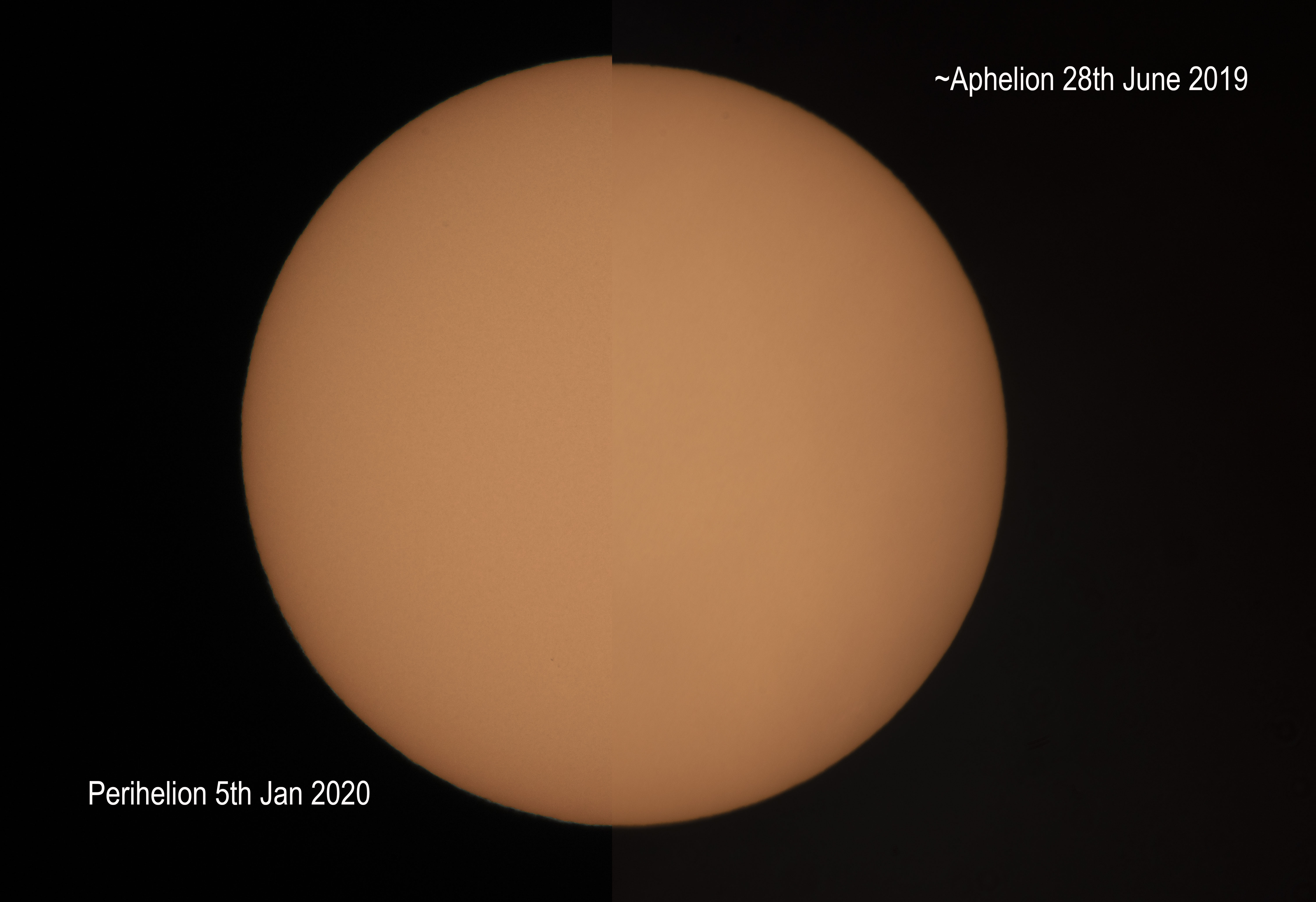 Perihelion for 2020, the point in Earth's elliptical orbit when it is closest to the Sun, occurred on January 5th. The distance from the Sun doesn't determine the seasons, though. Those are governed by the tilt of Earth's axis of rotation, so January is still winter in the north and summer in southern hemisphere. But it does mean that on January 5 the Sun was at its largest apparent size. This composite neatly compares two pictures of the Sun, both taken from planet Earth with the same telescope and camera. The left half was captured on the date of the 2020 perihelion. The right was recorded only a week before the July 4 date of the 2019 aphelion, the farthest point in Earth's orbit. Otherwise difficult to notice, the change in the Sun's apparent diameter between perihelion and aphelion amounts to a little over 3 percent. The 2020 perihelion and the preceding 2019 aphelion correspond to the closest and farthest perihelion and aphelion of the 21st century.