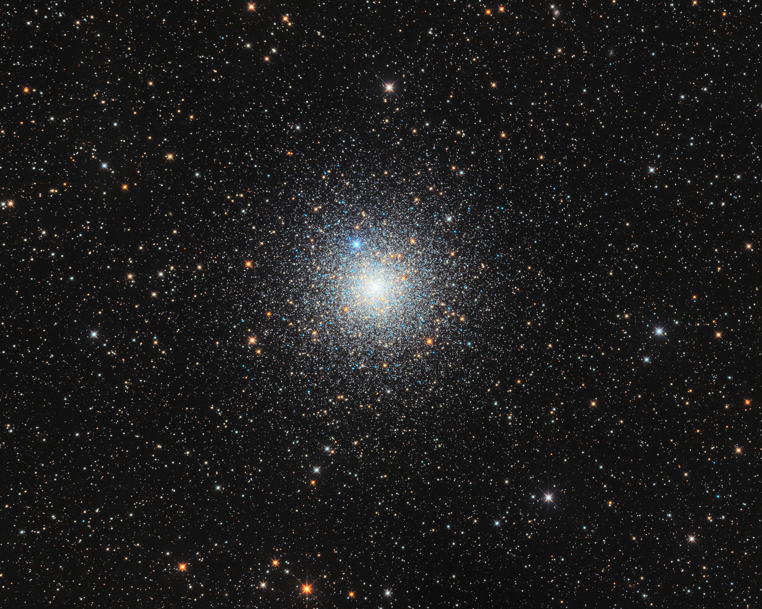 A unos 13 000 años luz de distancia, en dirección a la constelación austral Pavo, el aglomerado globular de estrellas NGC 6752 se desplaza por el halo de nuestra galaxia Vía Láctea. Con más de 10 000 millones de años de antigüedad, NGC 6752 ocupa el tercer lugar en brillo entre los aglomerados globulares visibles en el cielo nocturno de la Tierra, después de los aglomerados Omega Centauri y 47 Tucanae. Contiene más de cien mil estrellas en una esfera de unos 100 años luz de diámetro. Exploraciones telescópicas del NGC 6752 han revelado que una fracción notable de las estrellas cercanas al núcleo del aglomerado son sistemas estelares múltiples. También muestran la presencia de estrellas azules estragadas, estrellas que parecen ser demasiado jóvenes y masivas para existir en un aglomerado cuyas estrellas se espera que tengan al menos el doble de la edad del Sol. Se cree que las estrellas azules estragadas se forman por fusiones y colisiones estelares en el denso entorno estelar del núcleo del aglomerado. Esta composición de color precisa también destaca las antiguas estrellas gigantes rojas del aglomerado en tonos amarillentos. (Nota: La estrella azul brillante y con púas a las 11 en punto desde el centro del aglomerado es una estrella de primer plano situada a lo largo de la línea de visión hacia NGC 6752)