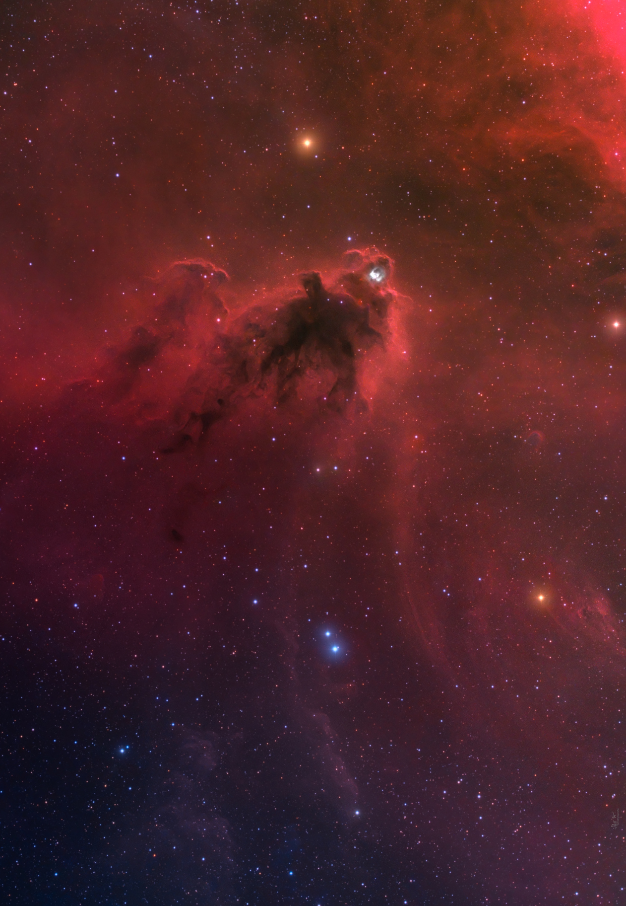 La silueta de una intrigante nebulosa oscura habita en esta escena cósmica. La nebulosa oscura de Lynds (LDN) 1622 aparece contra un fondo tenue de gas de hidrógeno brillante, visible solo en exposiciones telescópicas largas de la región. En contraste, la nebulosa de reflexión vdB 62 es más fácil de ver, justo arriba y a la derecha del centro. LDN 1622 se encuentra cerca del plano de nuestra galaxia, la Vía Láctea, y está cerca en el cielo de la Bucle de Barnard, una gran nube que rodea el complejo rico de nebulosas de emisión encontrado en la Cintura y la Espada de Orión. Con contornos retrocedidos, el polvo que oscurece LDN 1622 se cree que se encuentra a una distancia similar, quizás a 1500 años luz. A esa distancia, este campo de visión de 1 grado abarcaría aproximadamente 30 años luz. Estrellas jóvenes sí están ocultas dentro del oscuro espacio y han sido reveladas en imágenes infrarrojas del telescopio espacial Spitzer. Sin embargo, el aspecto visual amenazador de LDN 1622 inspira su nombre popular, la Nebulosa del Hada Malvada.