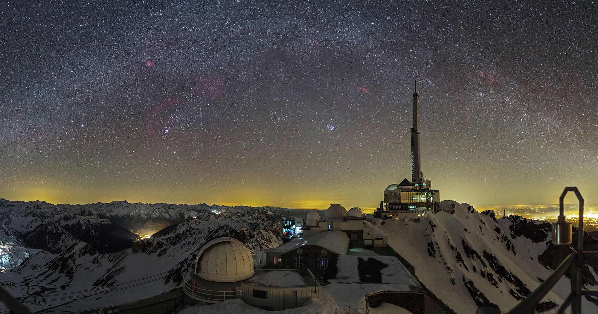 A surreal night skyscape, this panorama stitched from 12 photos looks to the west at an evening winter sky over Pic du Midi Observatory, Pyrenees Mountains, Planet Earth. Telescope domes and a tall communications tower inhabit the rugged foreground. On the right, lights from Tarbes, France about 35 kilometers away impinge on the designated dark sky site though, but more distant terrestrial lights seen toward the left are from cities in Spain. Stars and nebulae of the northern winter's Milky Way arc through the sky above. Known to the planet's night skygazers, the Pleiades and Hyades star clusters still hang over the western horizon near center. Captured in mid February the familiar stars of the constellation Orion are to the left and include the no longer fainting star Betelgeuse.