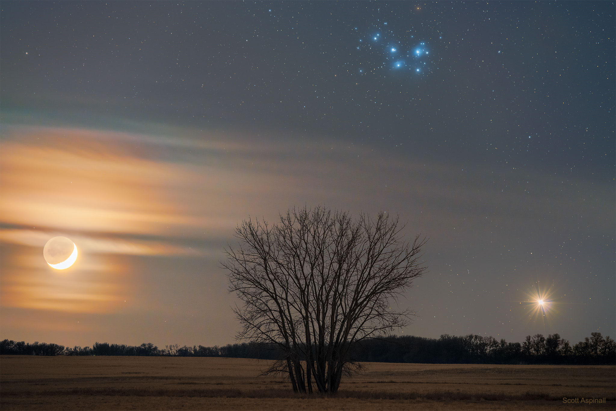 It was an astronomical triple play. Setting on the left, just after sunset near the end of last month, was our Moon -- showing a bright crescent phase. Setting on the right was Venus, the brightest planet in the evening sky last month -- and this month, too. With a small telescope, you could tell that Venus' phase was half, meaning that only half of the planet, as visible from Earth, was exposed to direct sunlight and brightly lit. High above and much further in the distance was the Pleiades star cluster. Although the Moon and Venus move with respect to the background stars, the Pleiades do not -- because they are background stars. In the beginning of this month, Venus appeared to move right in front of the Pleiades, a rare event that happens only once every eight years. The featured image captured this cosmic triangle with a series of exposures taken from the same camera over 70 minutes near Avonlea, Saskatchewan, Canada. The positions of the celestial objects was predicted. The only thing unpredicted was the existence of the foreground tree -- and the astrophotographer is still unsure what type of tree that is.