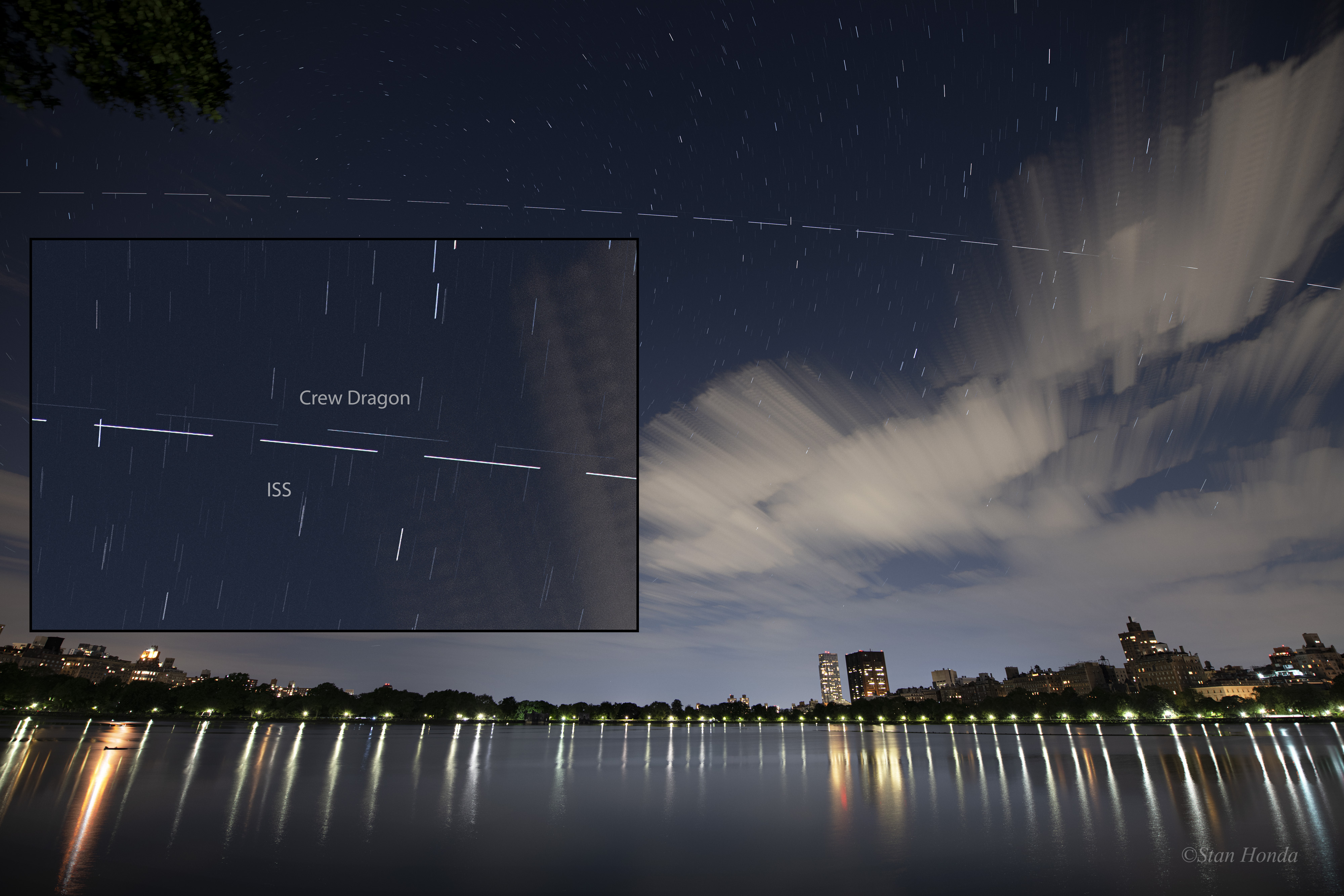 Still bathed in sunlight the International Space Station (ISS) arced through this Manhattan evening sky on May 30. Moving left to right, its bright trail was captured in this composite image with a series of 5 second long exposures. Stars left short trails and lights were reflected in still waters looking toward the north across the Central Park reservoir. Chasing the ISS in low Earth orbit the Crew Dragon spacecraft dubbed Endeavour also left a trail through that urban night. Seen about 6 hours after its launch the spacecraft's faint trail appears above the ISS, shown in the inset just as the two approached the bank of clouds at the right. Dragon Endeavour docked successfully with the ISS about nineteen hours after reaching orbit.