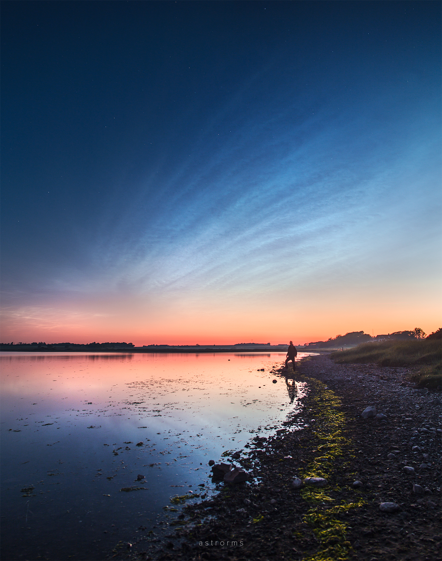 Transfundiendo la luz solar a través de un cielo oscuro, esta hermosa exhibición de nubes noctilucentes fue capturada esta semana, reflejada en aguas tranquilas desde Nykobing Mors, Dinamarca. Desde el borde del espacio, a unos 80 kilómetros sobre la superficie terrestre, las nubes heladas mismas aún reflejan la luz solar, aunque el Sol está por debajo del horizonte visto desde el suelo. Normalmente observadas en latitudes altas durante los meses de verano, estas nubes que brillan de noche han aparecido temprano este año, a medida que las noches en el norte se acortan. También conocidas como nubes mesosféricas polares, se entiende que se forman cuando el vapor de agua es transportado hacia la fría atmósfera superior y se condensa sobre partículas finas de polvo suministradas por meteoritos desintegrados o ceniza volcánica. La misión AIM de la NASA proporciona proyecciones diarias de las nubes noctilucentes vistas desde el espacio.