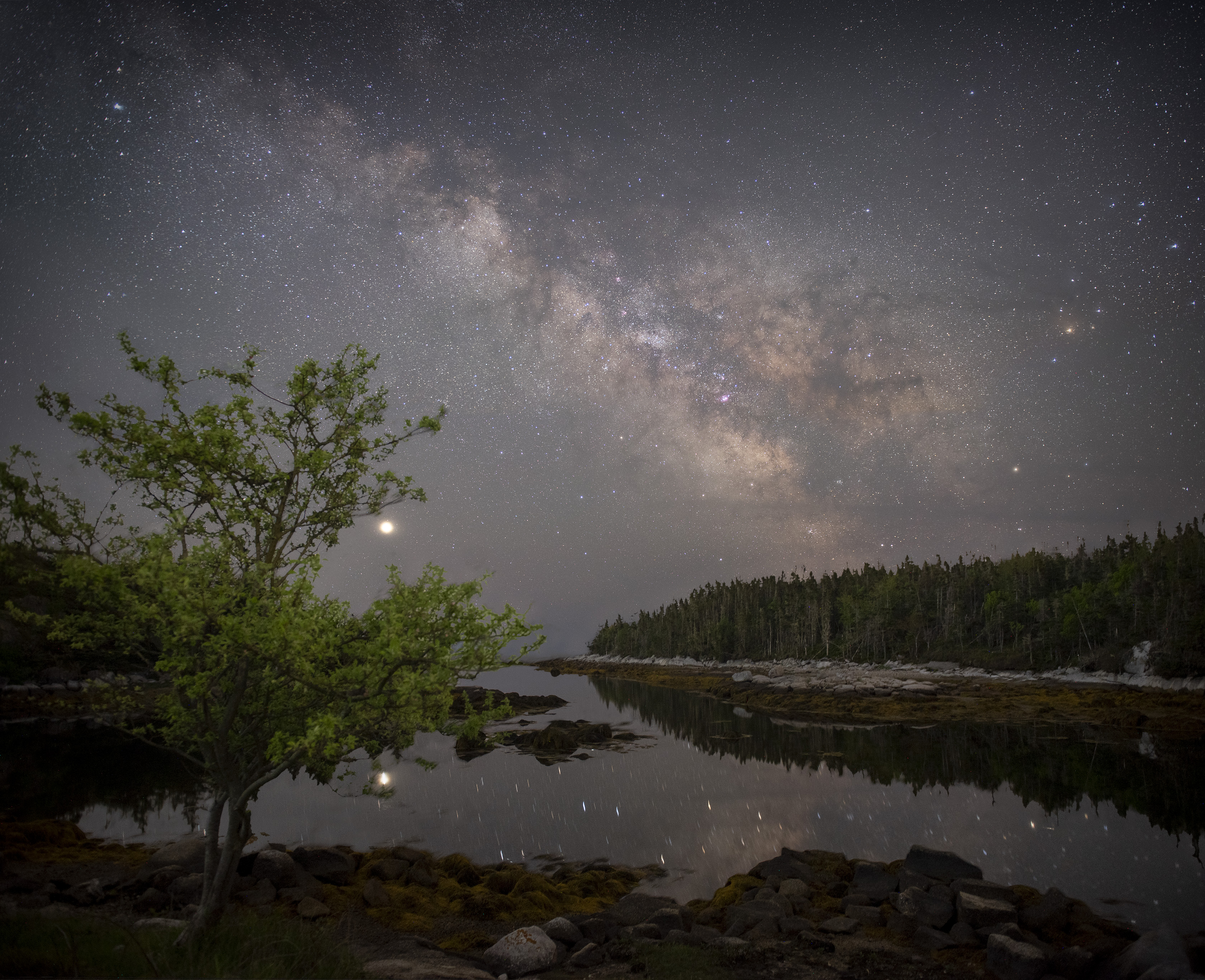 La Vía Láctea del viejo astrónomo arquea su camino a través de este tranquilo cielo del norte. Contra la tenue y difusa luz de las estrellas, puedes seguir las oscuras grietas de nubes de polvo interestelar que se extienden desde el núcleo de la galaxia. Estas se dirigen hacia la brillante estrella Antares, a la derecha, casi exactamente al sur sobre el horizonte. Sin embargo, la luz más brillante en la crepúsculo es Júpiter. Desde la perspectiva de la cámara, parece colgarse del borde de un árbol que enmarca el primer plano, por supuesto, un árbol de manzanas. Esta serena escena nocturna marítima fue registrada con exposiciones con y sin seguimiento el 16 de junio desde Dover, Nueva Escocia, en el planeta Tierra.