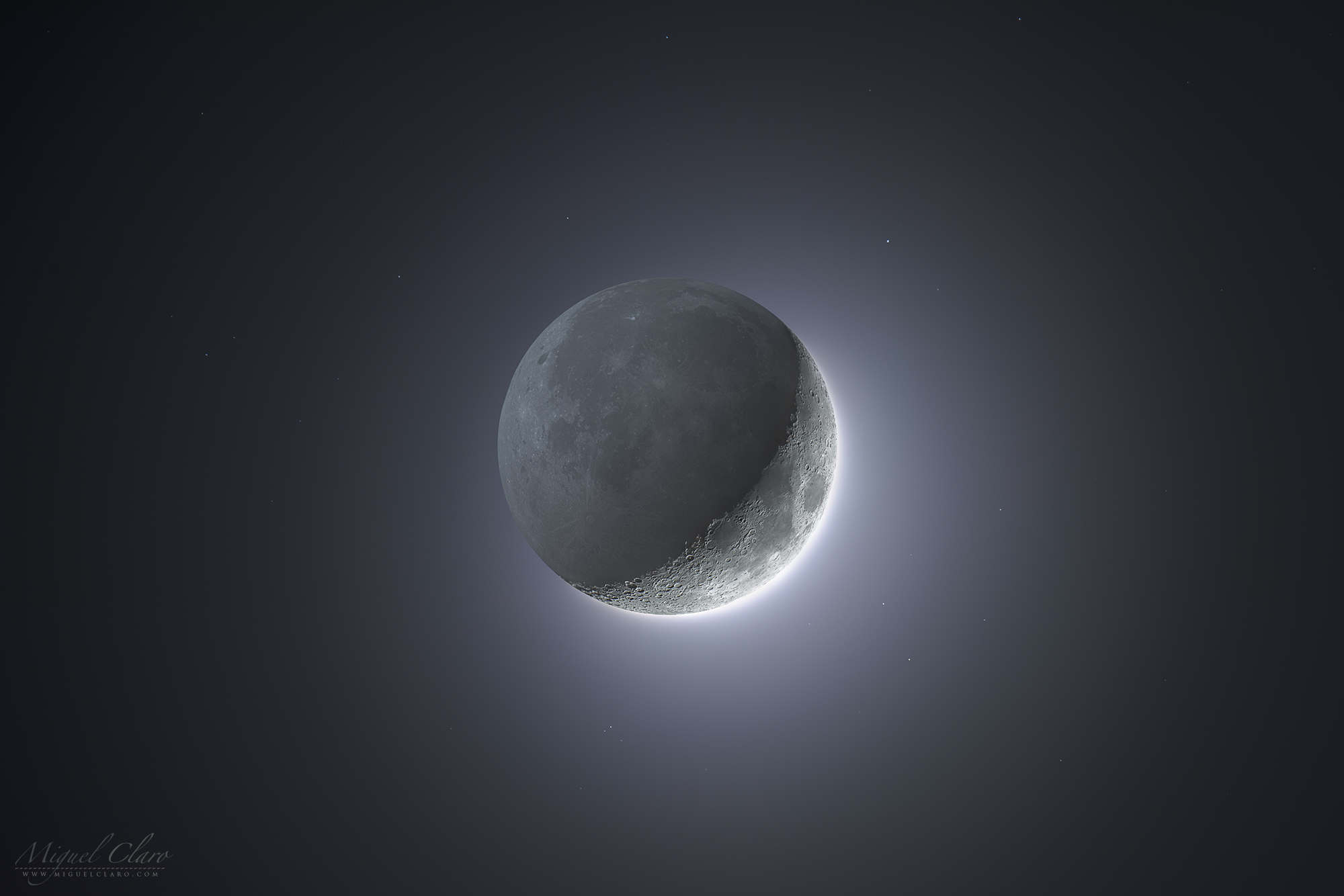 ¿Por qué la Luna creciente no se ve así? Por una razón, porque tus ojos no pueden discernir simultáneamente regiones brillantes y oscuras como esta. Llamada luz terrestre o brillo de Da Vinci, la parte no iluminada de una Luna creciente es visible pero normalmente difícil de ver porque es mucho más tenue que el arco iluminado por el Sol. Sin embargo, en nuestra era digital, las diferencias en brillo pueden reducirse artificialmente. La imagen destacada es en realidad un compuesto digital de 15 exposiciones cortas de la creciente brillante, y 14 exposiciones más largas del resto tenue. El origen del brillo de Da Vinci, explicado por Leonardo Da Vinci hace aproximadamente 510 años, es la luz solar reflejada primero por la Tierra hacia la Luna, y luego de vuelta desde la Luna a la Tierra.