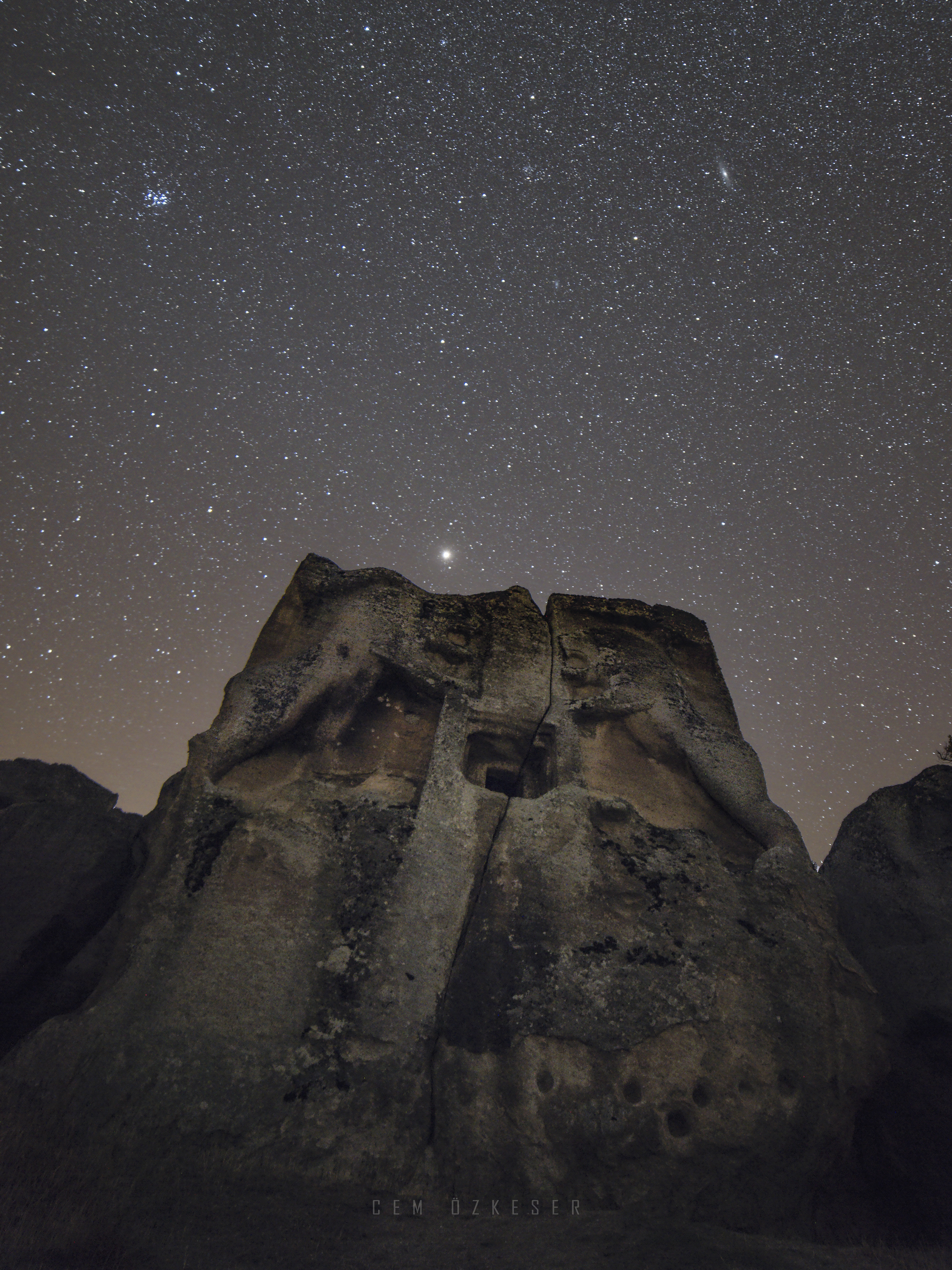 Three very different -- and very famous -- objects were all captured in a single frame last month. On the upper left is the bright blue Pleiades, perhaps the most famous cluster of stars on the night sky. The Pleiades (M45) is about 450 light years away and easily found a few degrees from Orion. On the upper right is the expansive Andromeda Galaxy, perhaps the most famous galaxy -- external to our own -- on the night sky. Andromeda (M31) is one of few objects visible to the unaided eye where you can see light that is millions of years old. In the middle is bright red Mars, perhaps the most famous planet on the night sky. Today Mars is at opposition, meaning that it is opposite the Sun, with the result that it is visible all night long. In the foreground is an ancient tomb in the Phygrian Valley in Turkey. The tomb, featuring two stone lions, is an impressive remnant of a powerful civilization that lived thousands of years ago. Mars, currently near its brightest, can be easily found toward the east just after sunset.