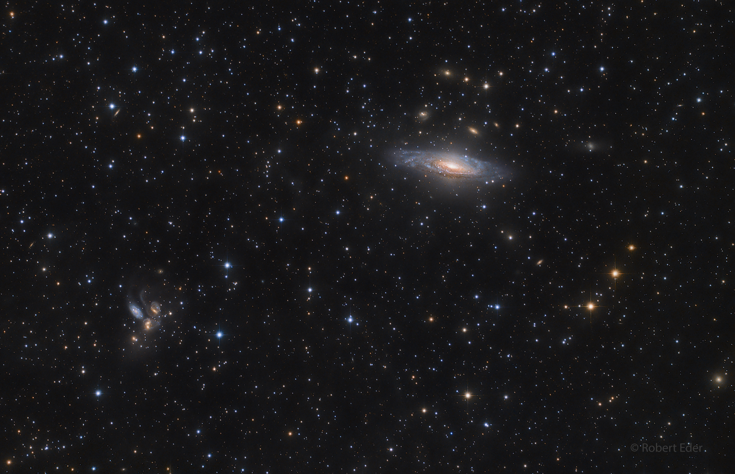 This sharp telescopic view reveals galaxies scattered beyond the stars of the Milky Way, at the northern boundary of the high-flying constellation Pegasus. Prominent at the upper right is NGC 7331. A mere 50 million light-years away, the large spiral is one of the brighter galaxies not included in Charles Messier's famous 18th century catalog. The disturbed looking group of galaxies at the lower left is well-known as Stephan's Quintet. About 300 million light-years distant, the quintet dramatically illustrates a multiple galaxy collision, its powerful, ongoing interactions posed for a brief cosmic snapshot. On the sky, the quintet and NGC 7331 are separated by about half a degree.