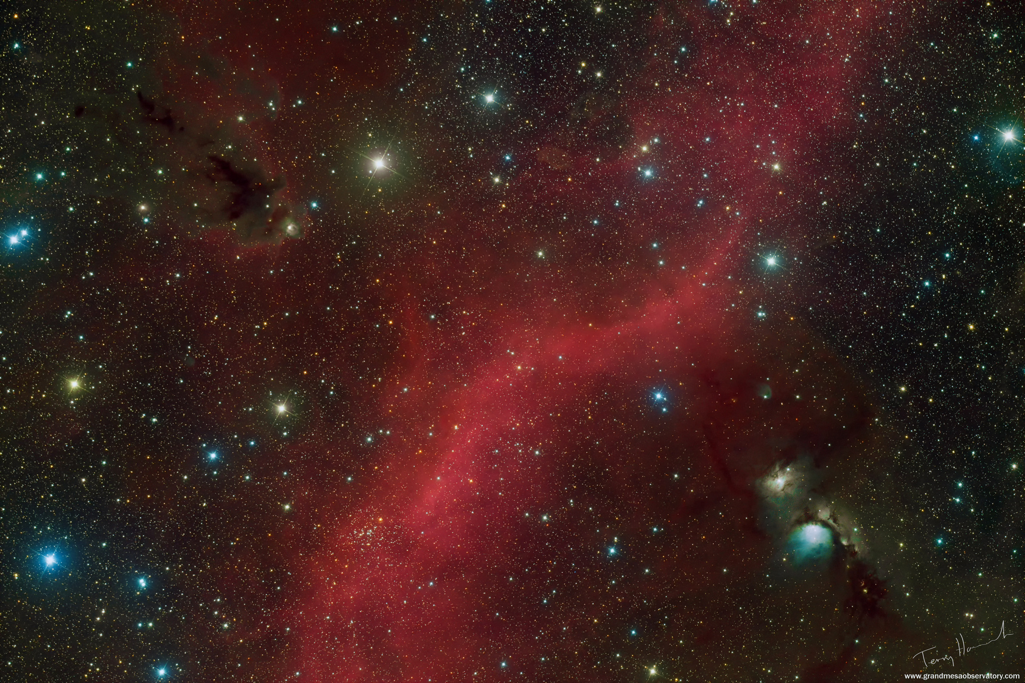 Bright stars, interstellar clouds of dust and glowing nebulae fill this cosmic scene, a skyscape just north of Orion's belt. Close to the plane of our Milky Way Galaxy, the wide field view spans just under 5 degrees or about 10 full moons on the sky. Striking bluish M78, a reflection nebula, is at the lower right. M78's tint is due to dust preferentially reflecting the blue light of hot, young stars. In colorful contrast, the red swath of glowing hydrogen gas streaming through the center is part of the region's faint but extensive emission nebula known as Barnard's Loop. At upper left, a dark dust cloud forms a prominent silhouette cataloged as LDN 1622. While M78 and the complex Barnard's Loop are some 1,500 light-years away, LDN 1622 is likely to be much closer, only about 500 light-years distant from our fair planet Earth.