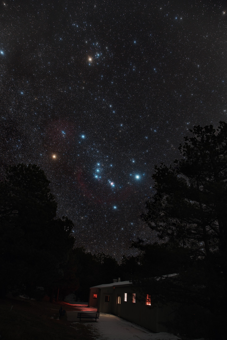 Orion siempre parece aparecer de lado en las noches de invierno en el norte. Esas estrellas familiares de la constelación del Cazador aparecen capturadas sobre los árboles en esta escena nocturna colorida. No es una estrella en absoluto, pero aún es visible a simple vista, el Gran Nebulosa de Orión brilla debajo de las estrellas del cinturón del Cazador. La exposición de la cámara revela el suave brillo rosáceo del lugar donde nacen las estrellas. Betelgeuse, la gigante estelar en el hombro de Orión, tiene el color de la iluminación cálida y acogedora de la Tierra, pero también lo tiene otra gigante estelar familiar, Aldebarán. Aldebarán, estrella alfa de la constelación de Tauro, el Toro, ancla la forma reconocible de V trazada por el cúmulo de las Híades hacia la parte superior del marco estrellado.